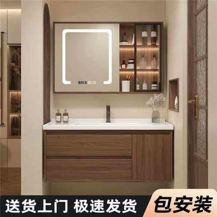 (包安装)胡桃木浴室柜组合现代简约卫生间陶瓷一体盆洗手洗脸盆