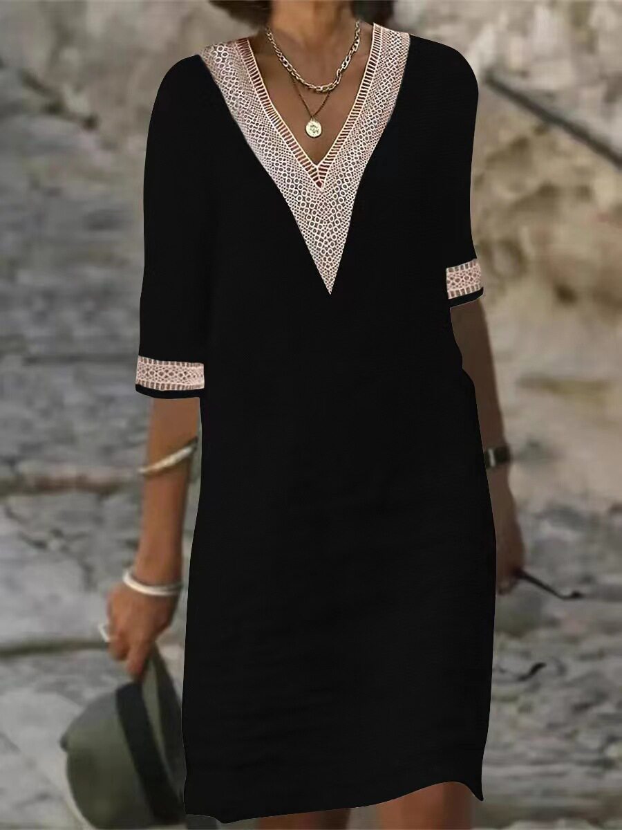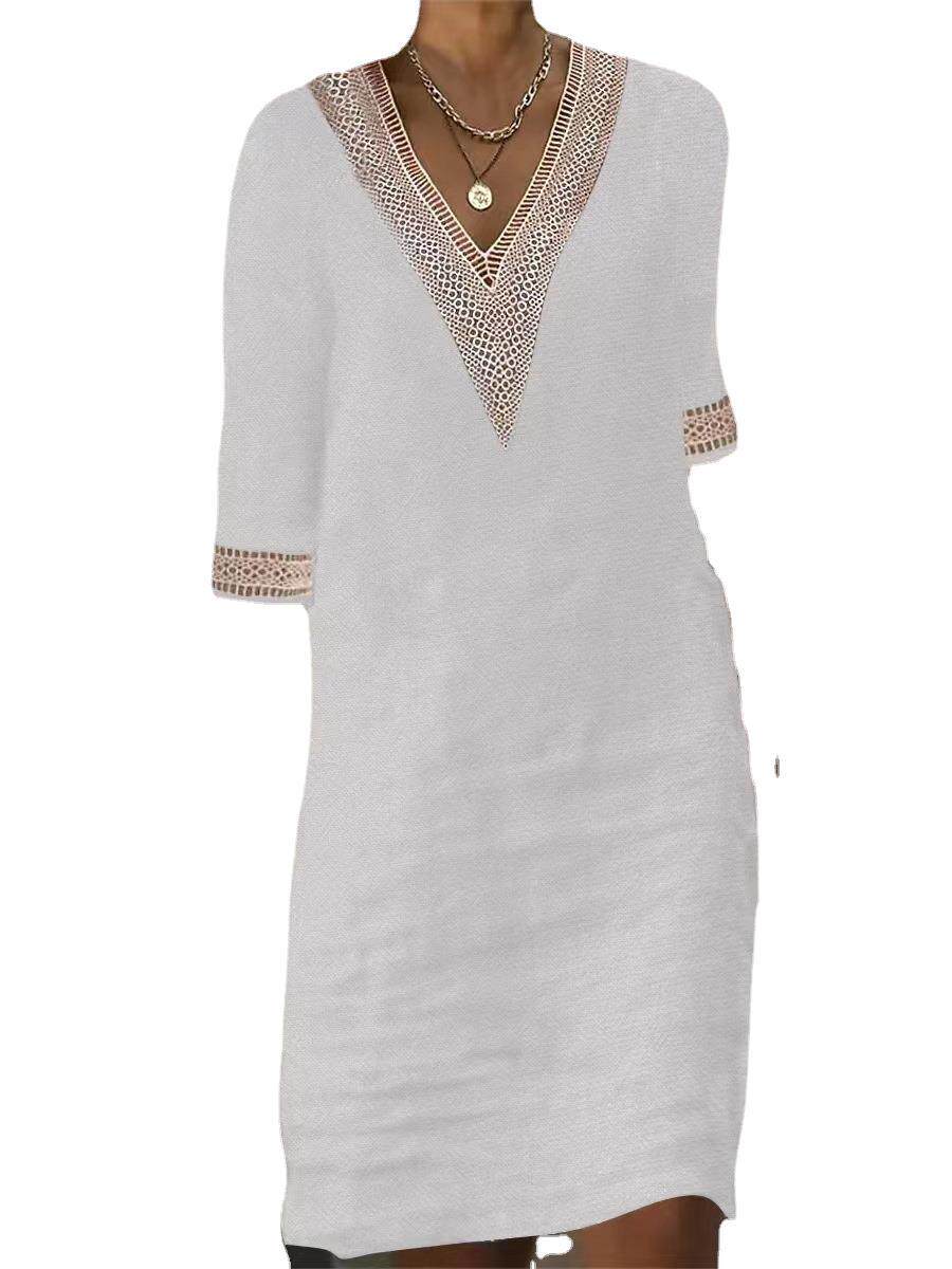 夏季欧美女装亚马逊独立站纯色V领蕾丝边中袖棉麻休闲连衣裙dress
