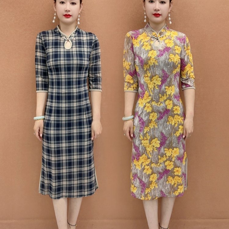 妈妈夏中袖旗袍连衣裙中老年裙子