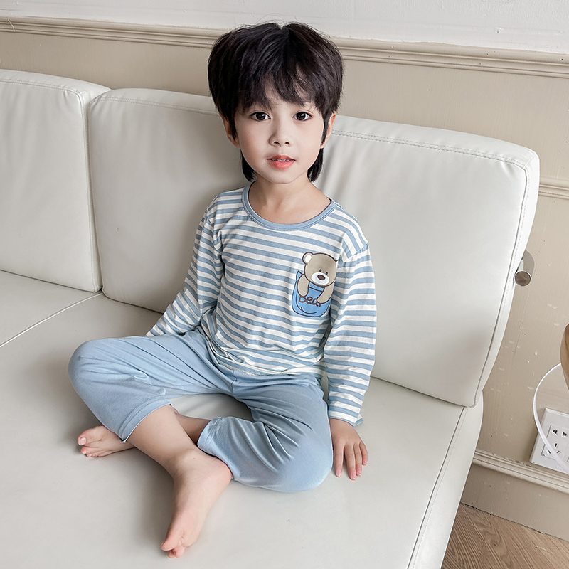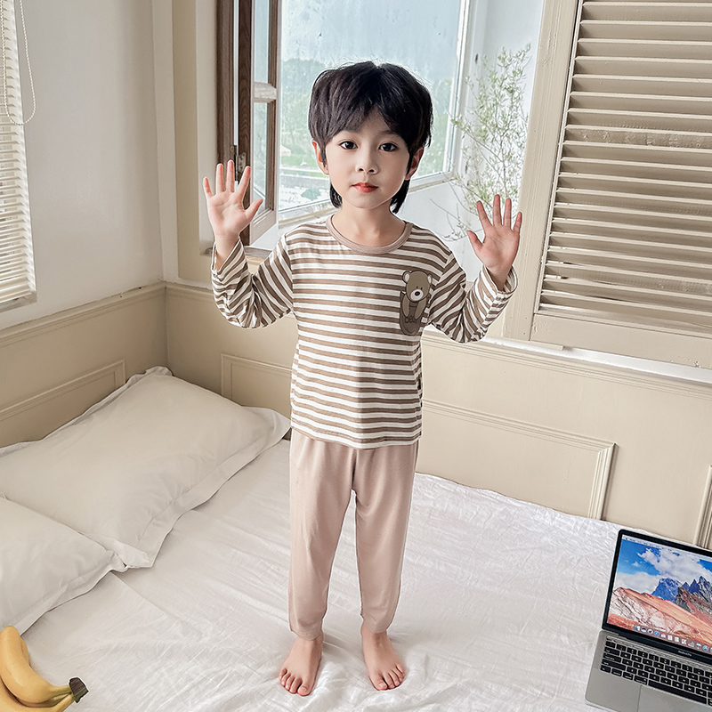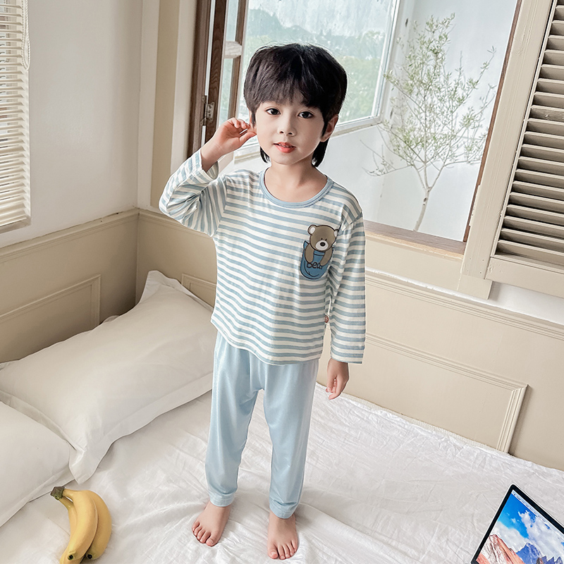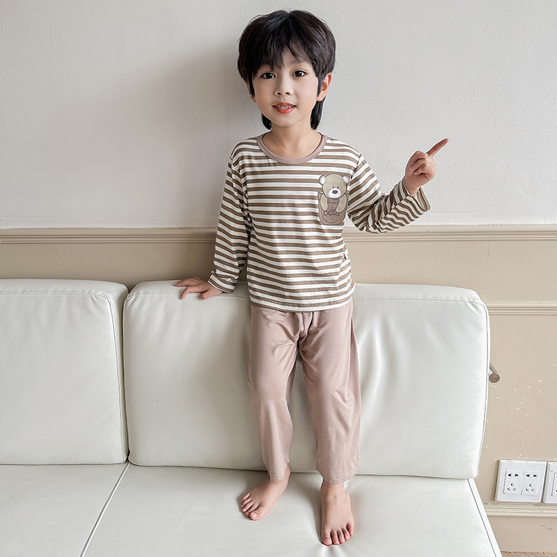 男童睡衣套装秋季男孩宝宝春秋莫代尔薄款条纹长袖卡通儿童家居服
