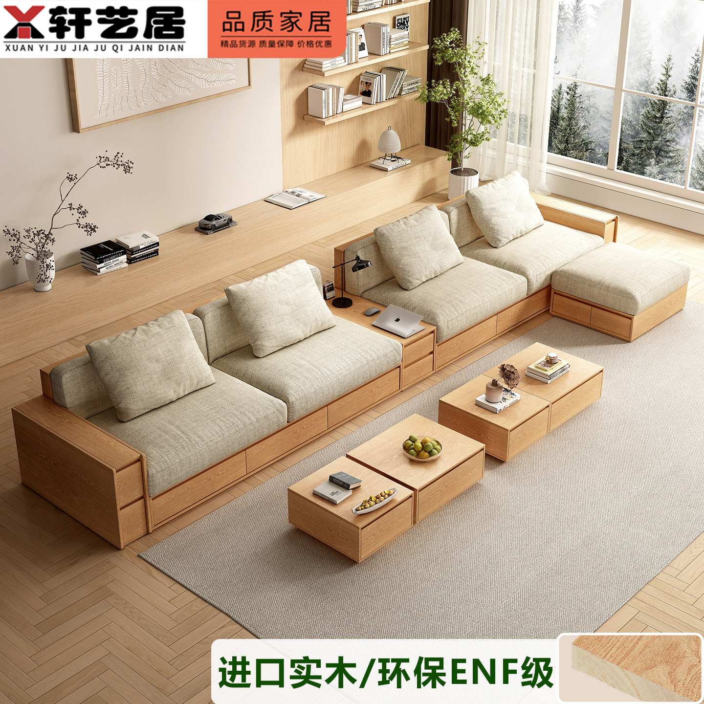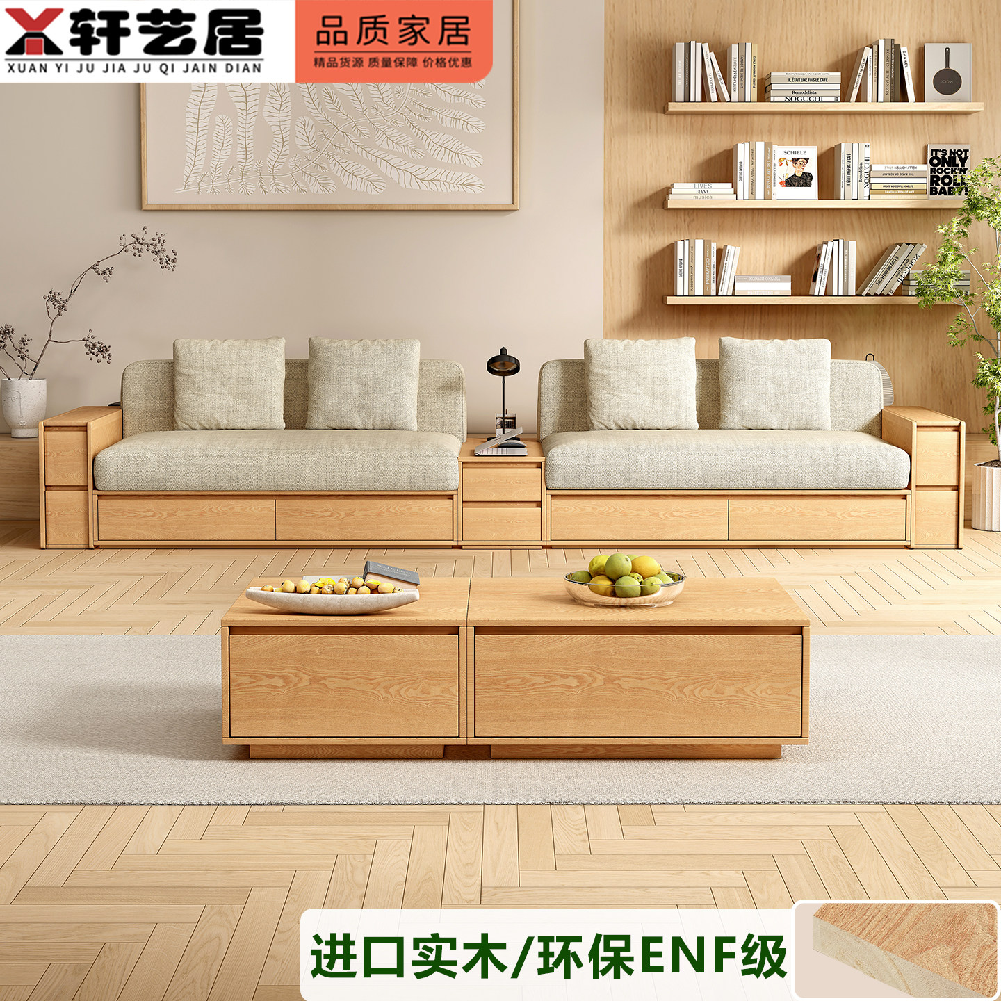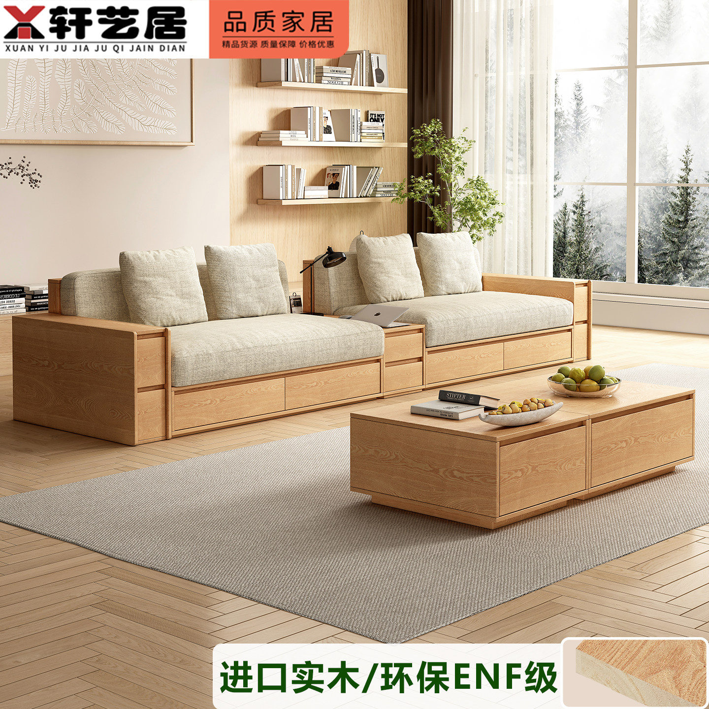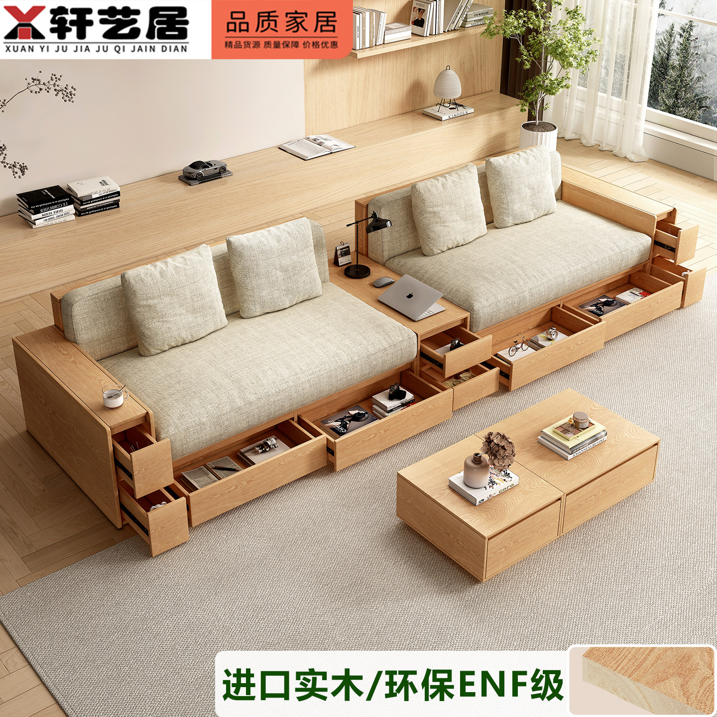 沙发板式储物实木沙发小户型原木风抽屉客厅家具米色布艺拆洗沙发