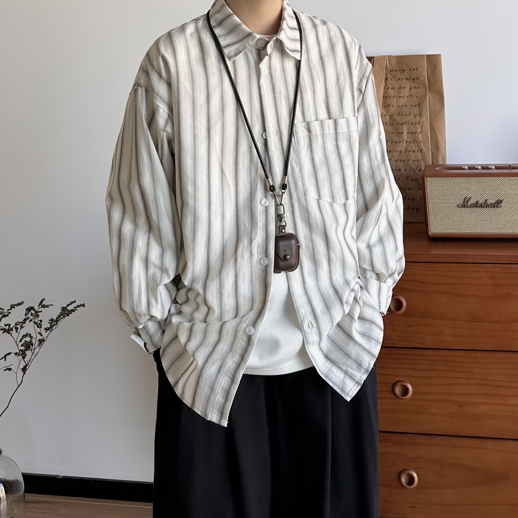B东日系男装美式简约复古竖条纹撞色宽松长袖衬衫男女春衬衣外套