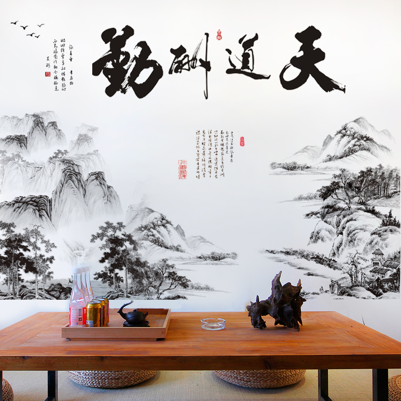 中式墙纸自粘卧室温馨中国风电视背景墙贴纸装饰山水床头墙壁贴画