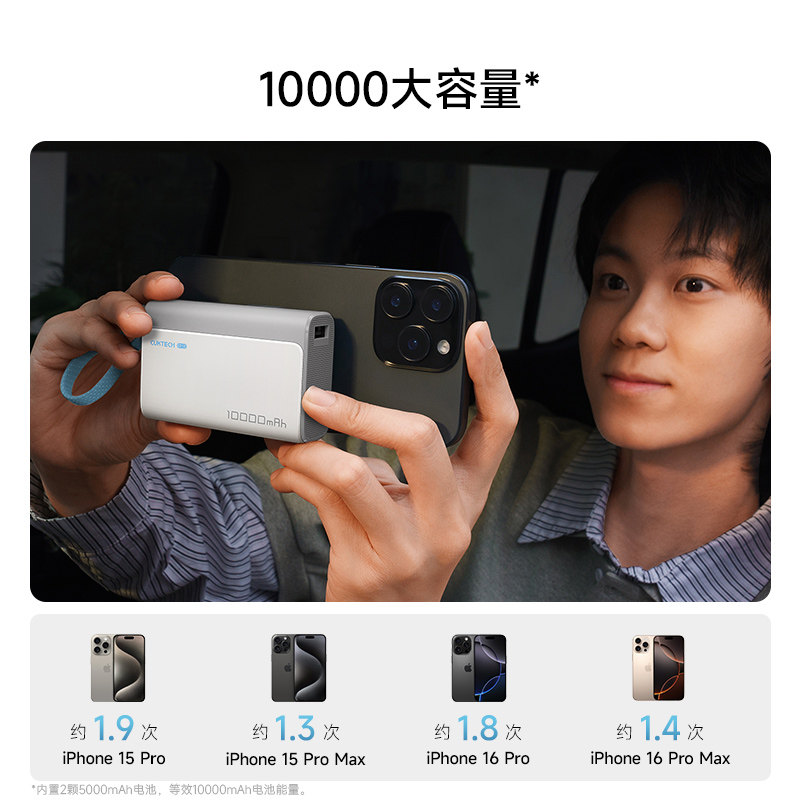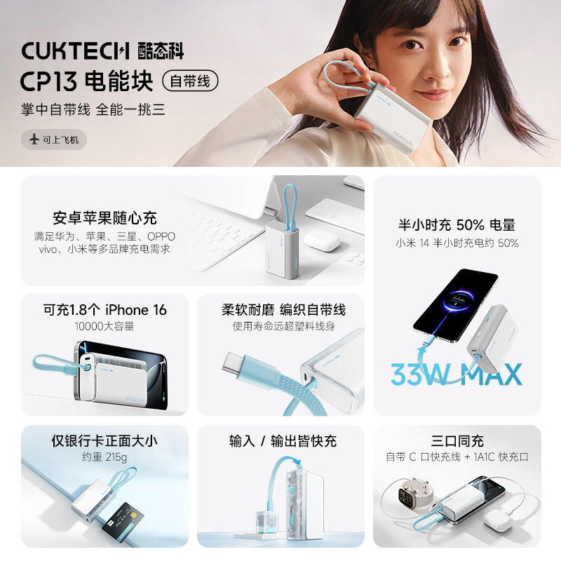 【3C认证】CUKTECH酷态科电芯10000毫安时CP13自带线充电宝33W快充小巧便携移动电源适用于iPhone苹果17Pro