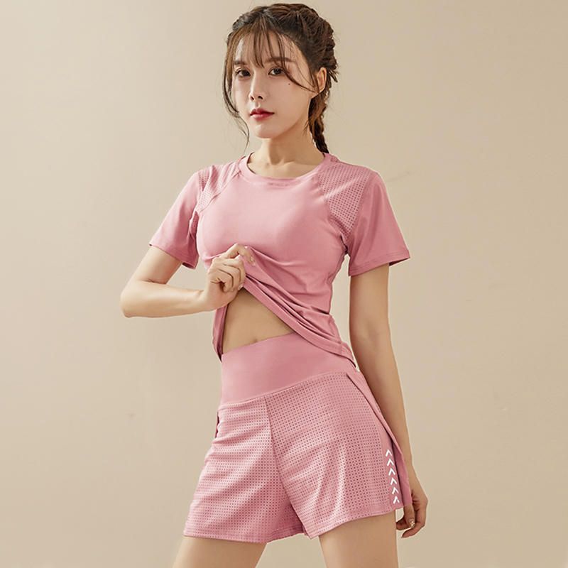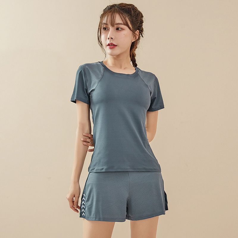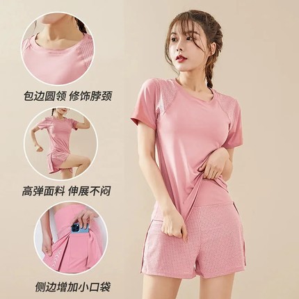 2023夏季瑜伽服套装女薄款透气短袖跑步上衣防走光速干短裤两件套