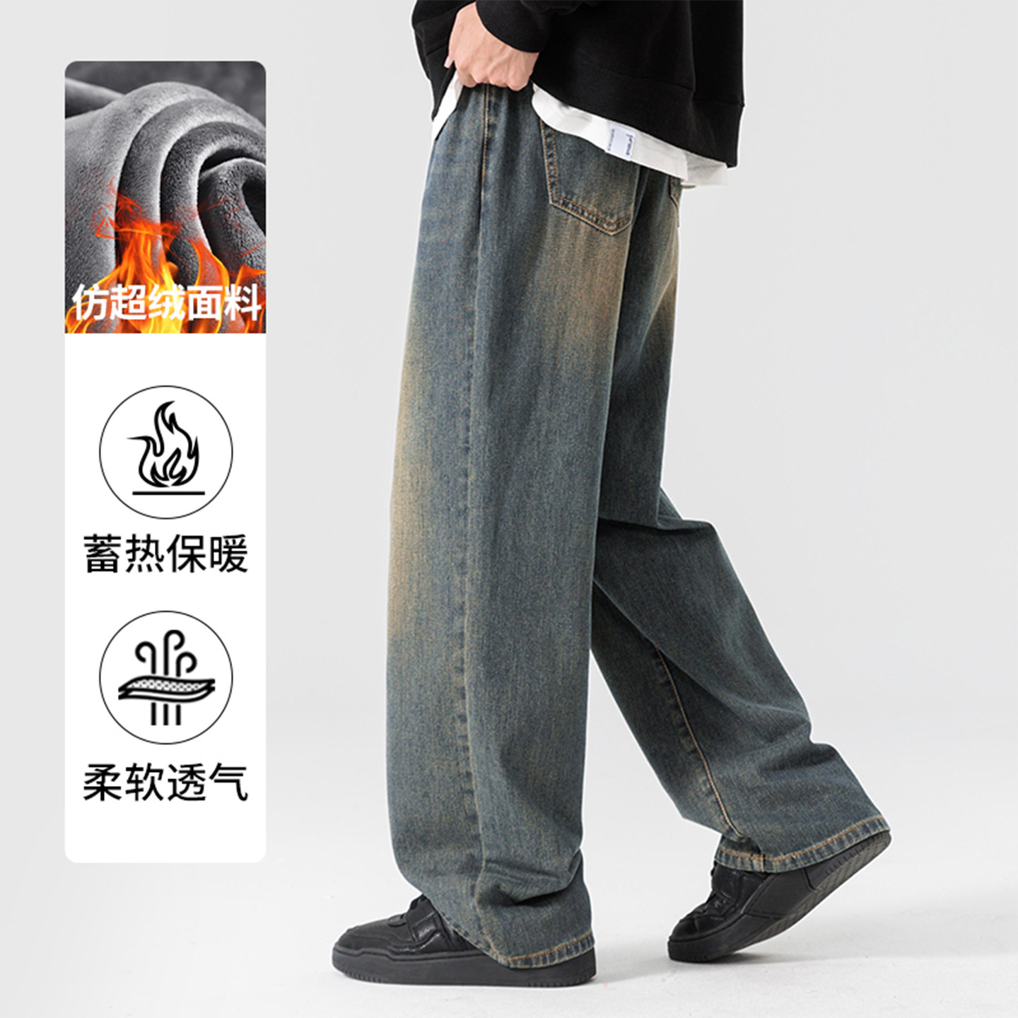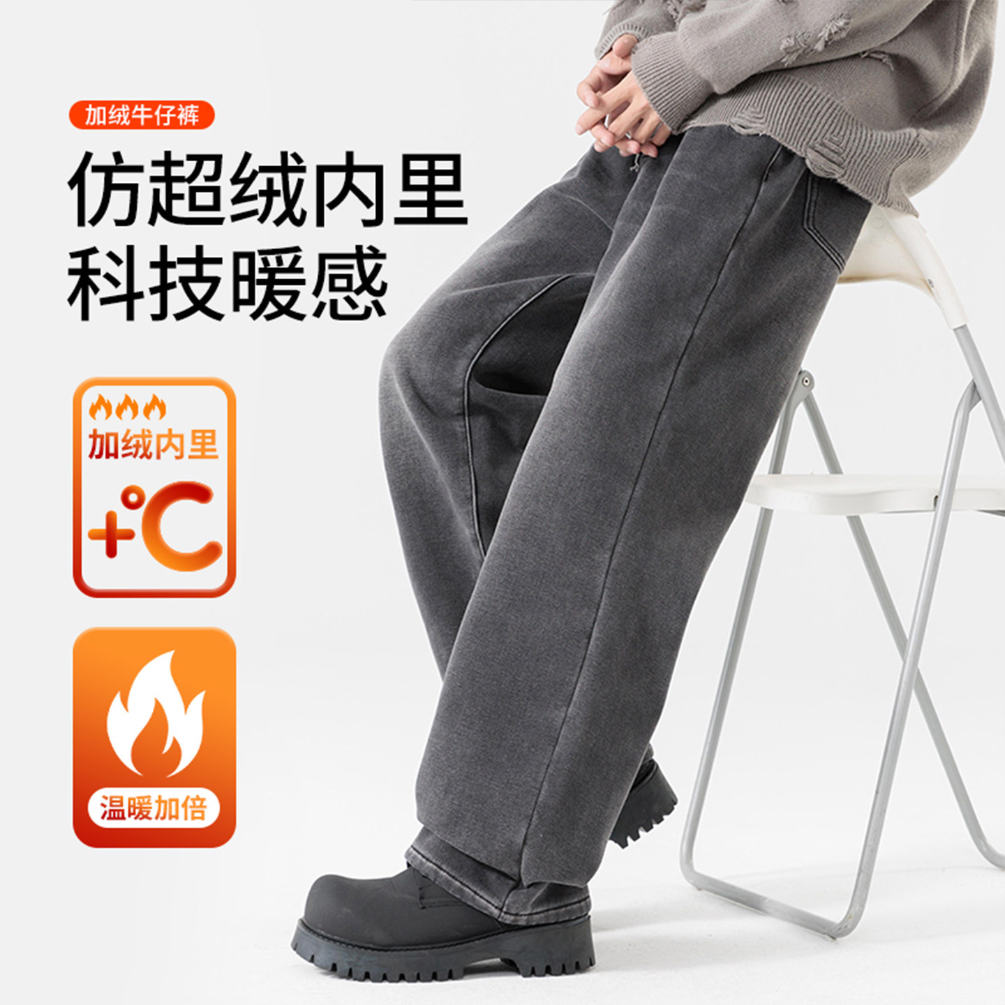 班尼路S&K直筒牛仔裤男秋冬季加绒加厚重磅水洗青少年阔腿休闲裤A