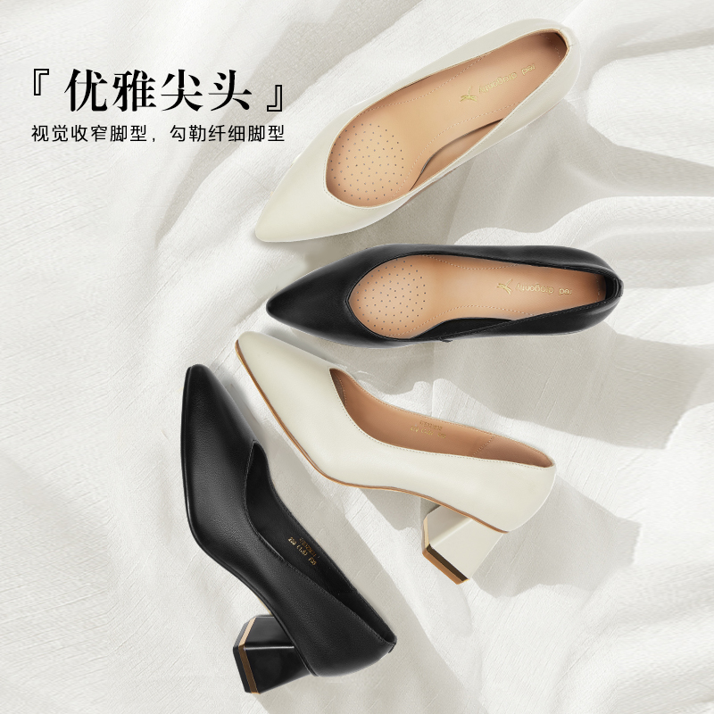 红蜻蜓女鞋春季新款一脚蹬真皮尖头粗跟高跟鞋百搭通勤浅口单鞋女