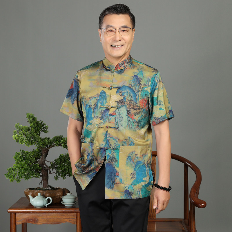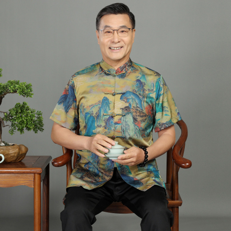 夏季中老年男士中国风山水画休闲时尚百搭薄款宽松加肥唐装短袖衬