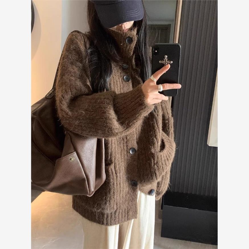 韩系灰色软糯高领开衫毛衣外套女秋冬外穿慵懒风宽松中长款针织衫