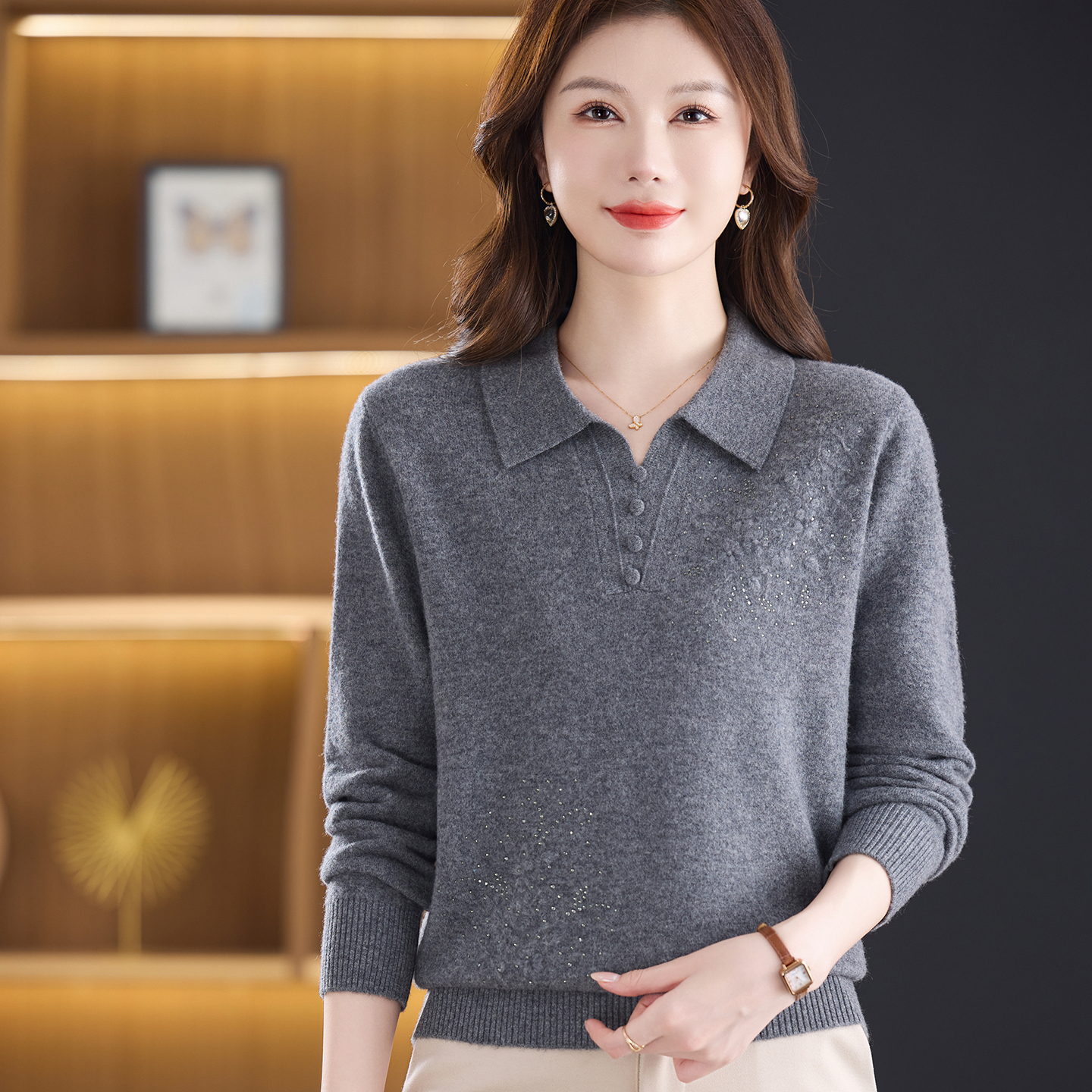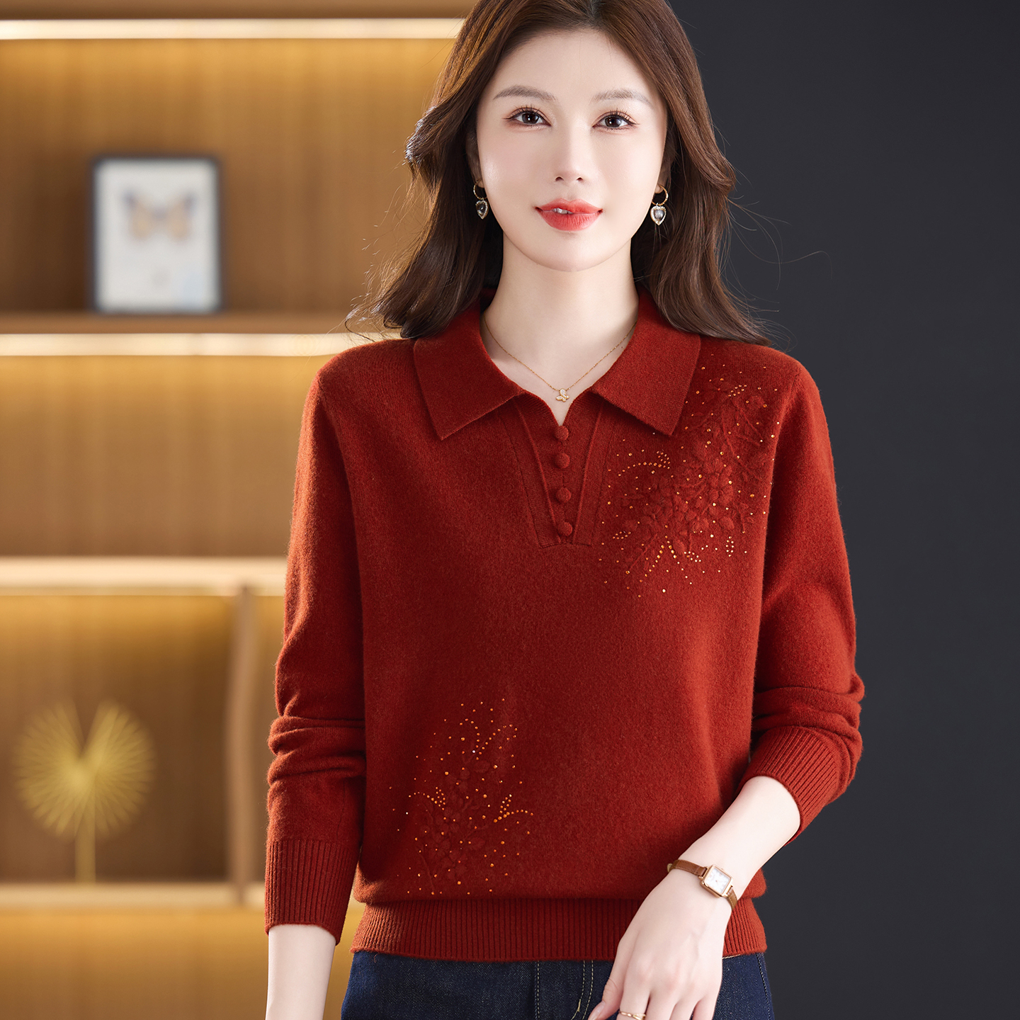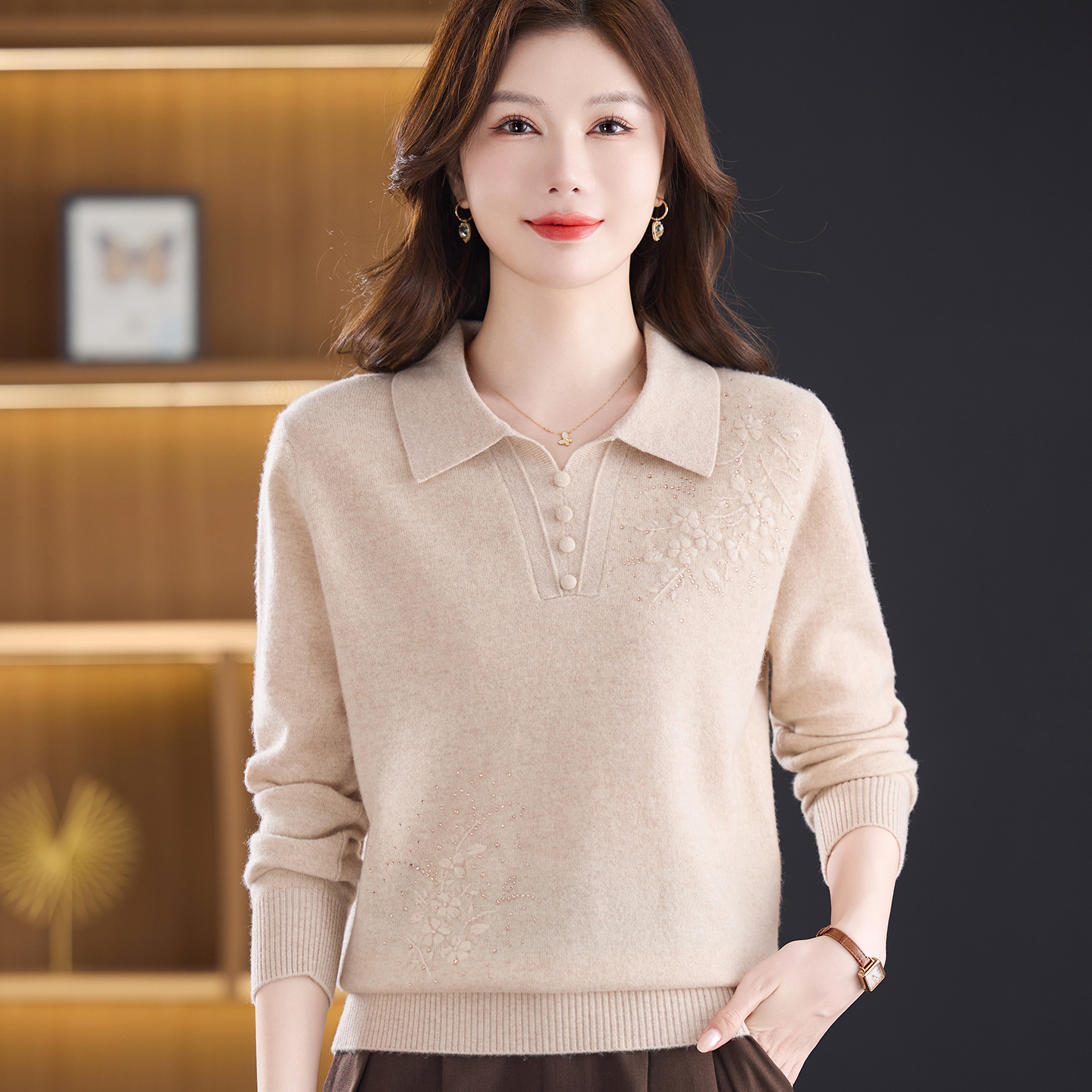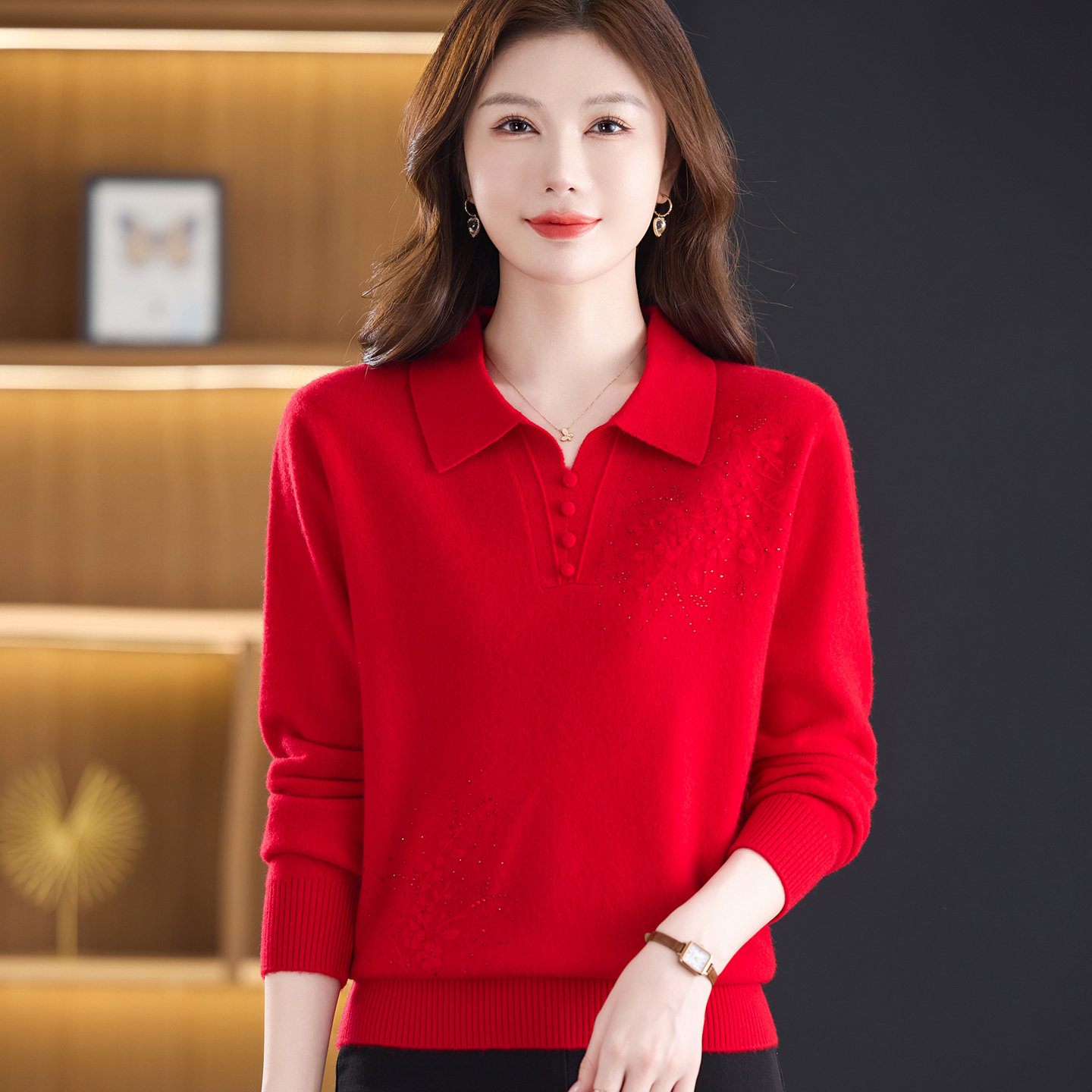 中老年女毛衣妈妈秋冬新款宽松纯羊毛衫高贵长袖套头针织翻领上衣