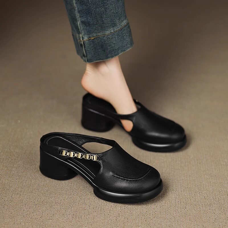 巨好穿踩屎感真皮厚底包头半拖女夏法式复古穆勒鞋高跟镂空凉拖鞋