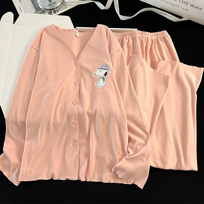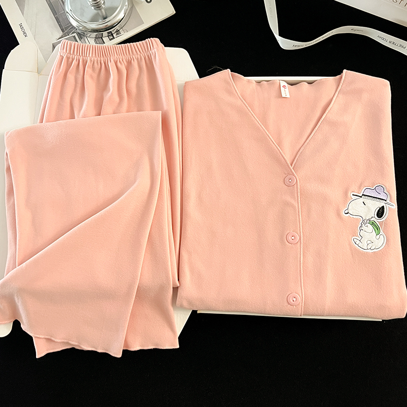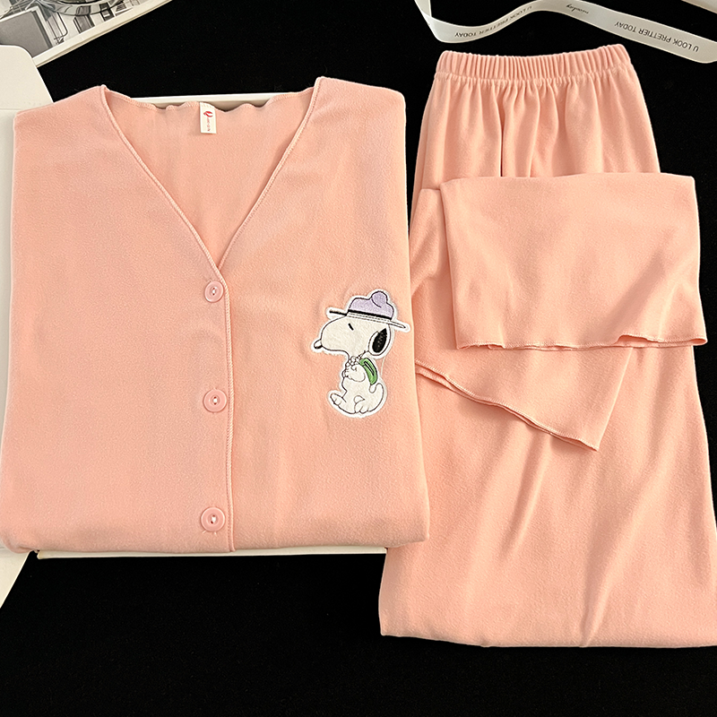 秋冬德绒简约休闲风睡衣女卡通史努比长袖开衫外穿V领家居服套装