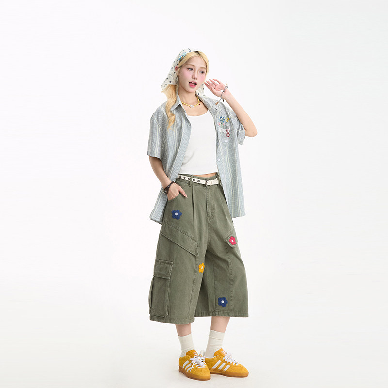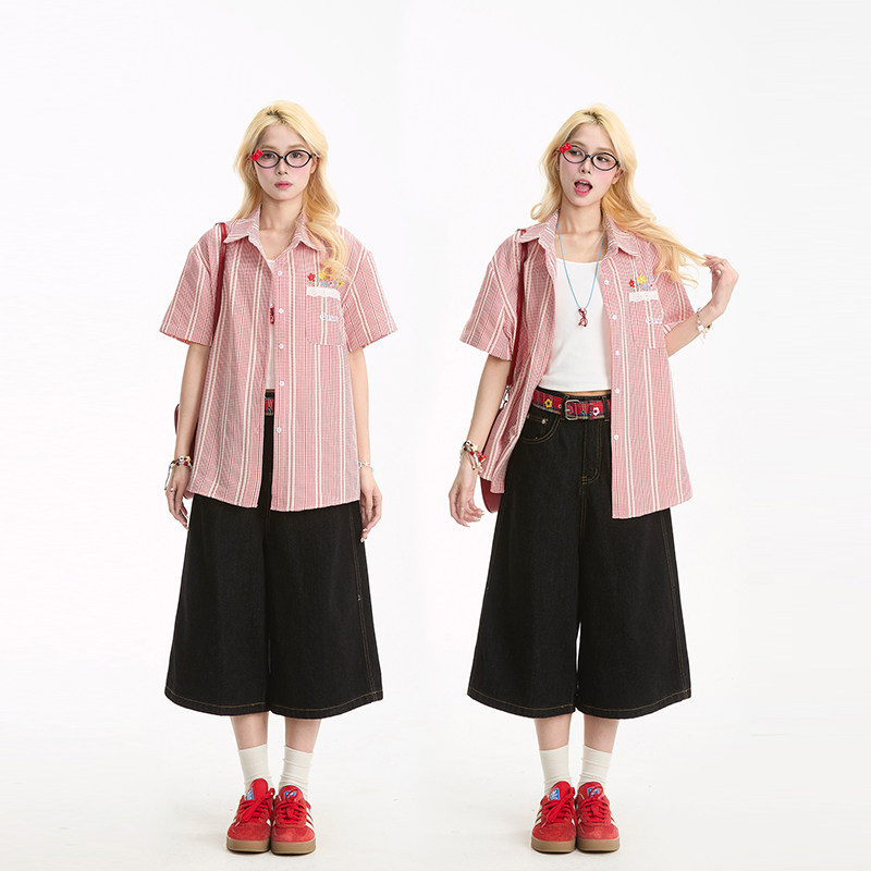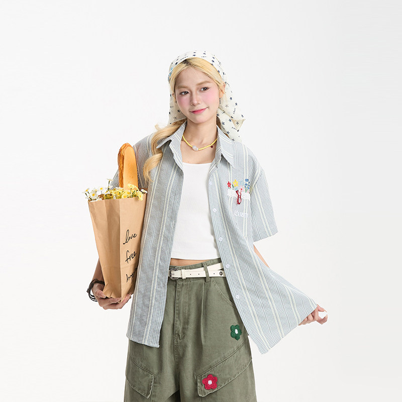 NERESUM红色格子条纹短袖衬衫女花卉刺绣学院风夏季宽松百搭衬衣