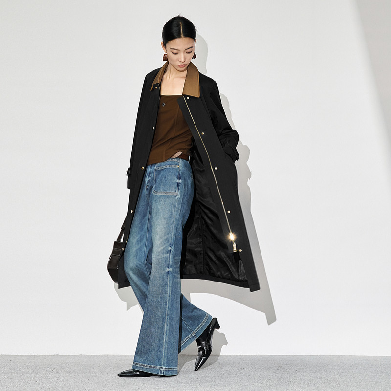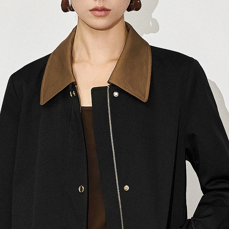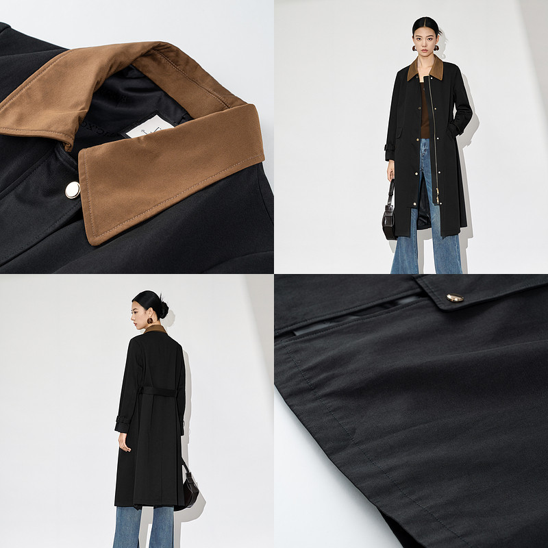 XG雪歌撞色翻领长袖休闲风衣2025秋季新款淑女风长款收腰外套女装