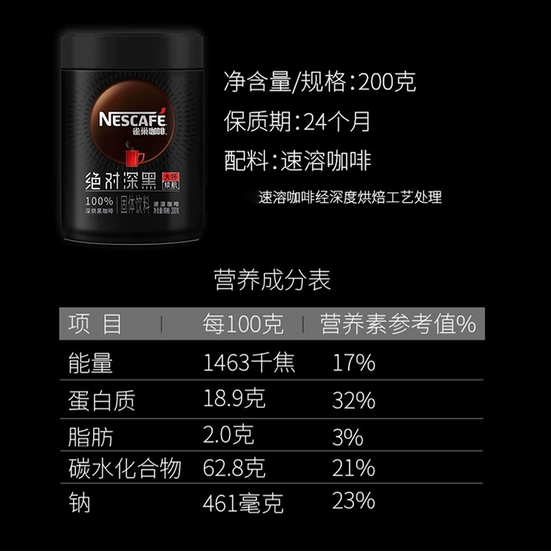 雀巢咖啡绝对深黑美式黑咖啡速溶咖啡粉200g罐装运动健身提神正品
