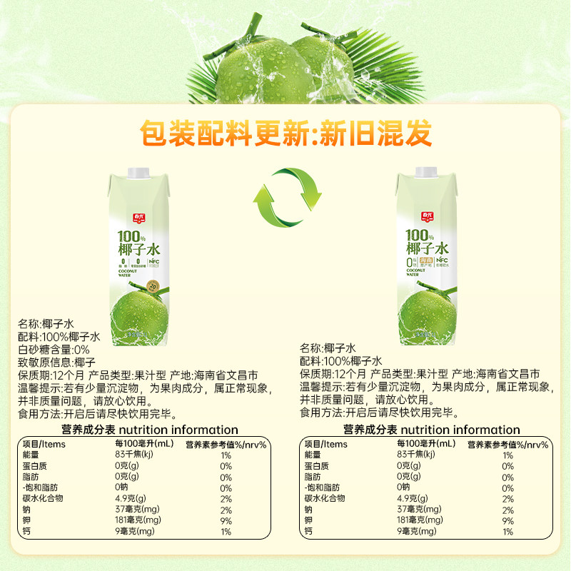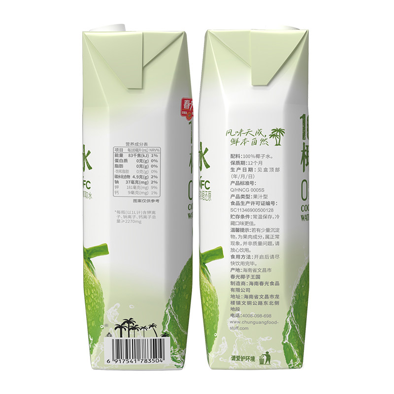 春光食品海南特产100%纯椰子水1L NFC椰青椰汁饮料椰子原浆