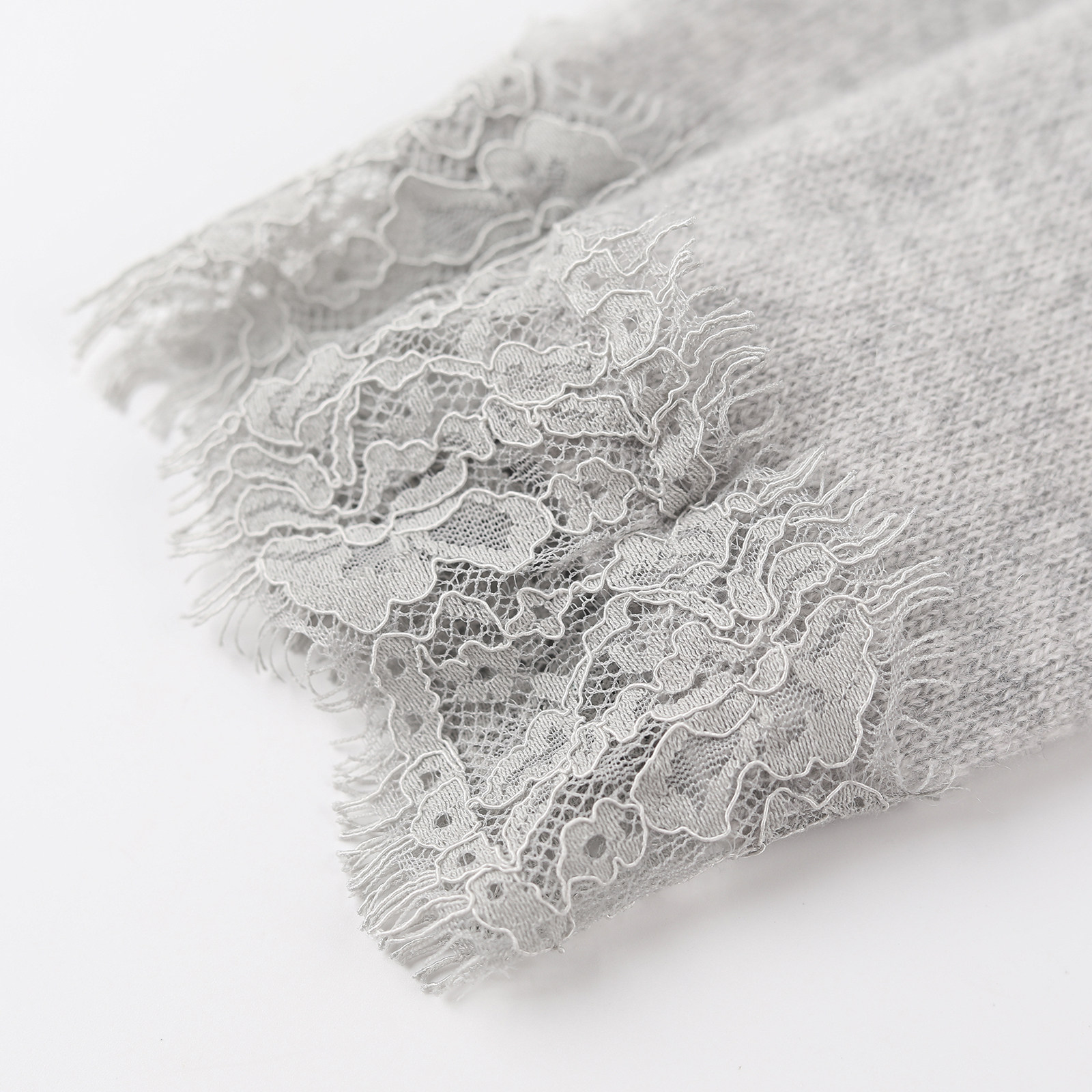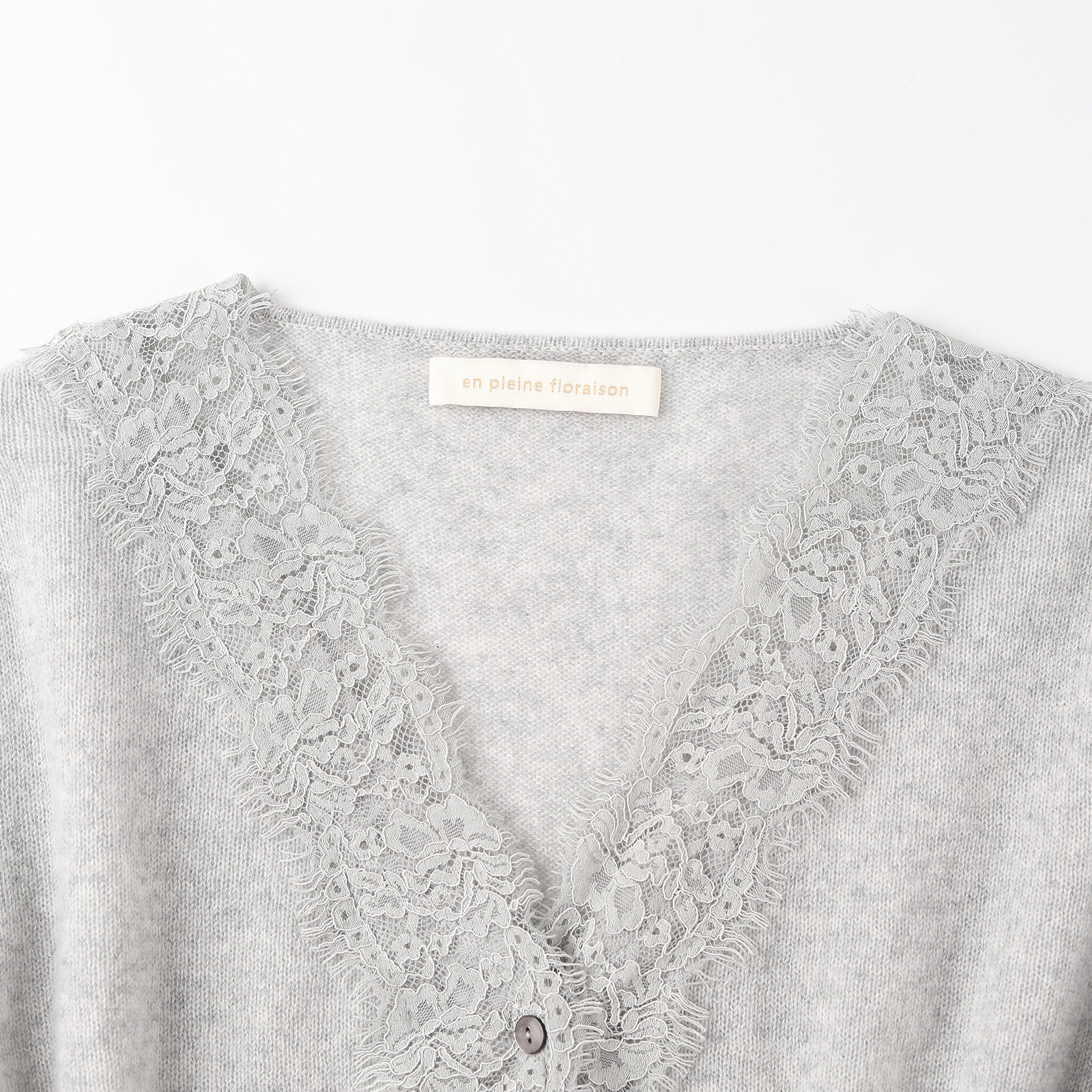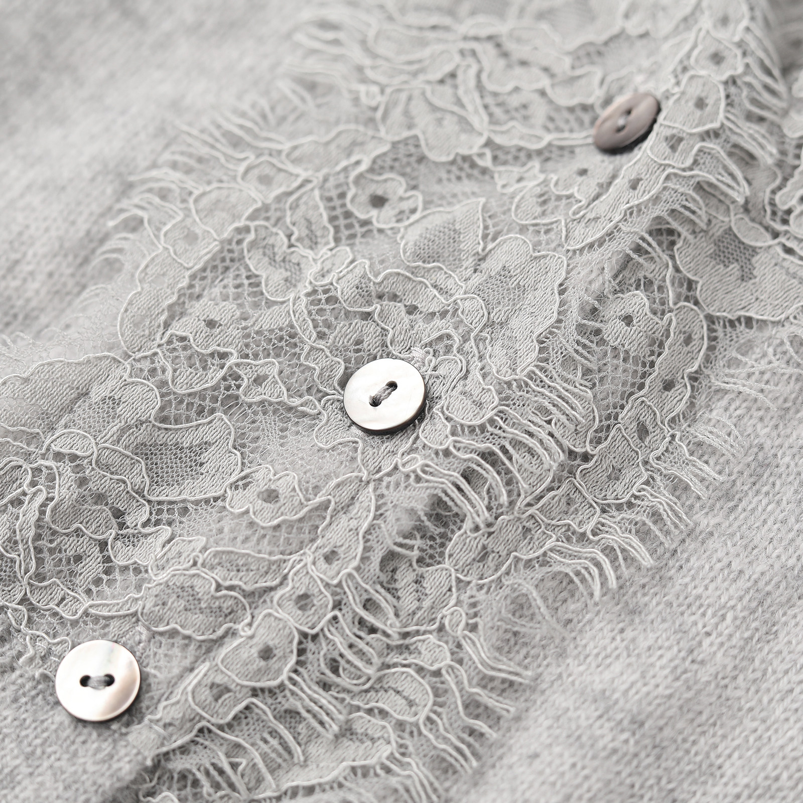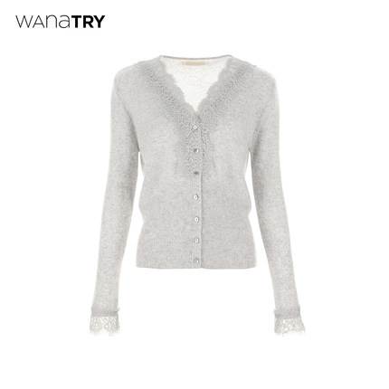 wana try100%山羊绒蕾丝软糯V领针织开衫春季新品灰色温柔上衣女