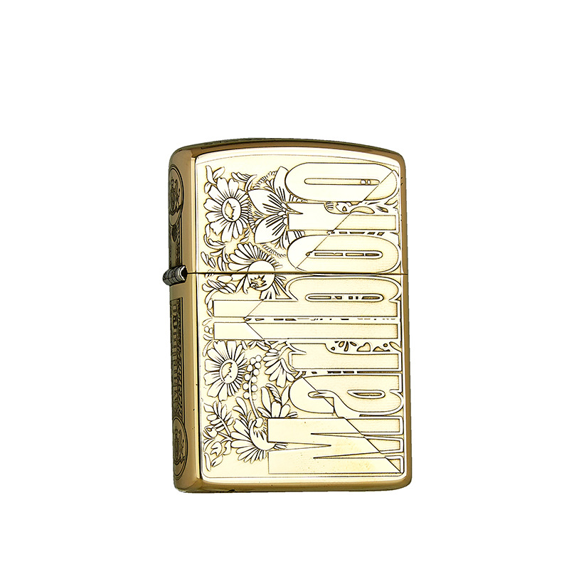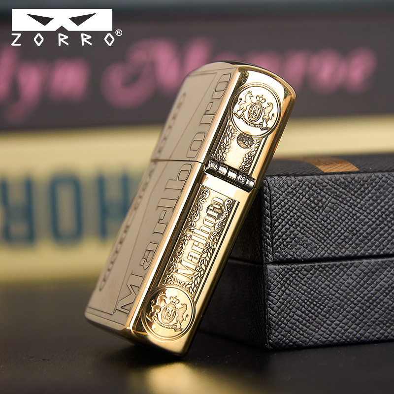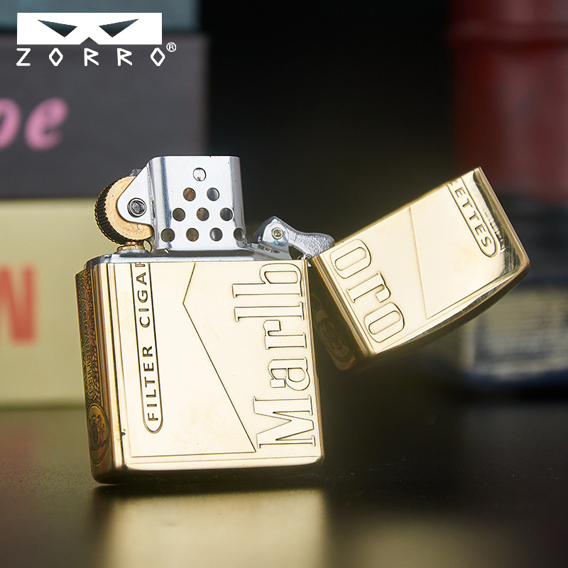 zorro佐罗正品砂轮煤油打火机铜壳二代眼镜标金色款唐草花万宝路
