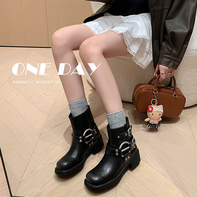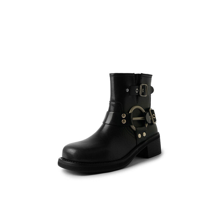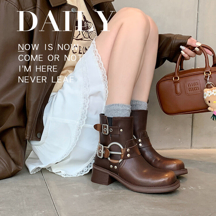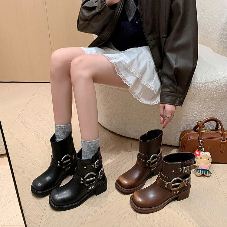 棕色真皮马丁靴女2024新款春季方头西部牛仔靴复古短靴女春秋单靴