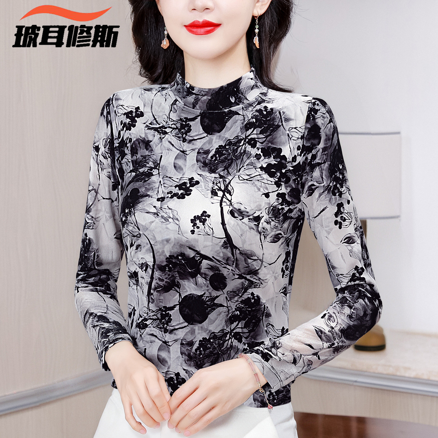 半高领秋冬新款水墨印花网纱打底衫长袖上衣女洋气大码显瘦T恤衫