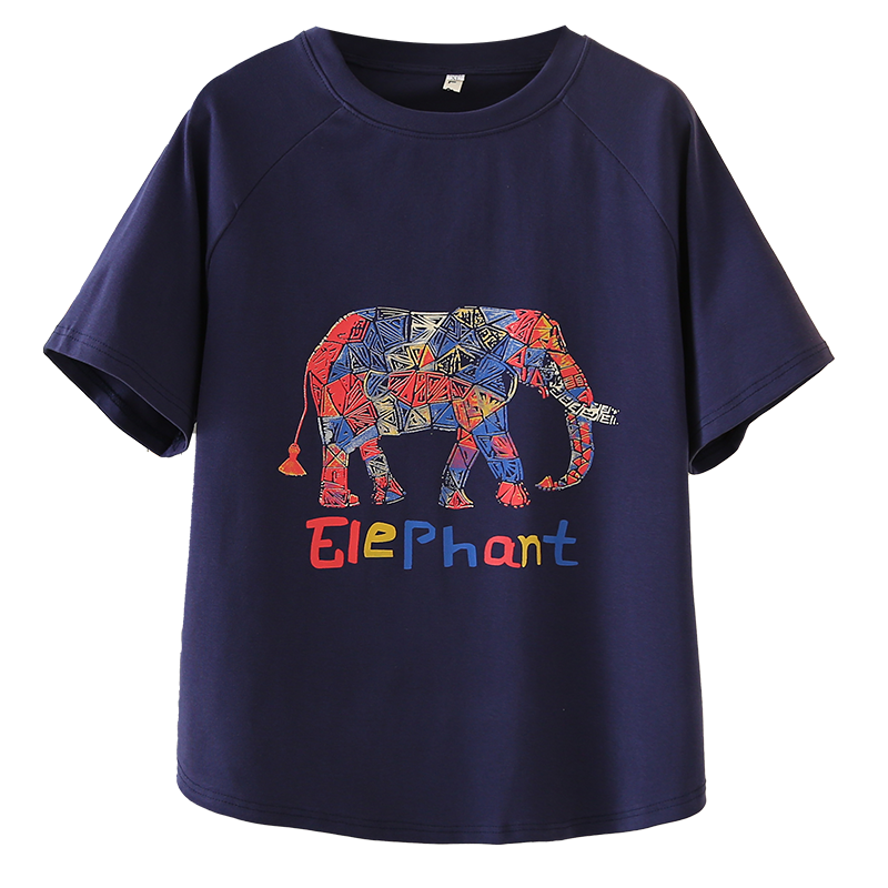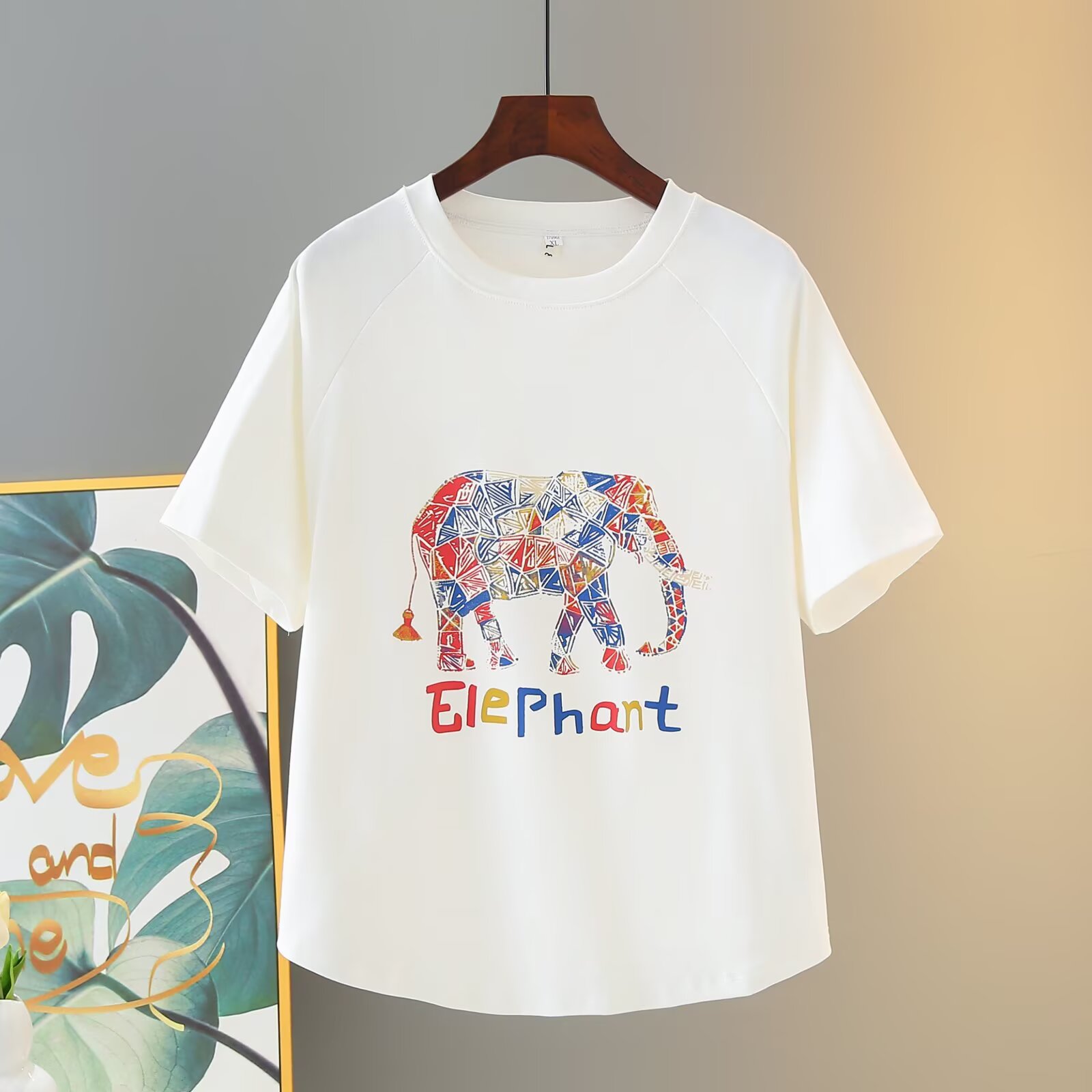 美式复古短袖t恤夏款小众独特别致正肩圆领小象印花大码半袖上衣
