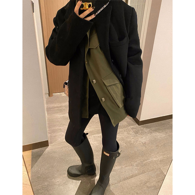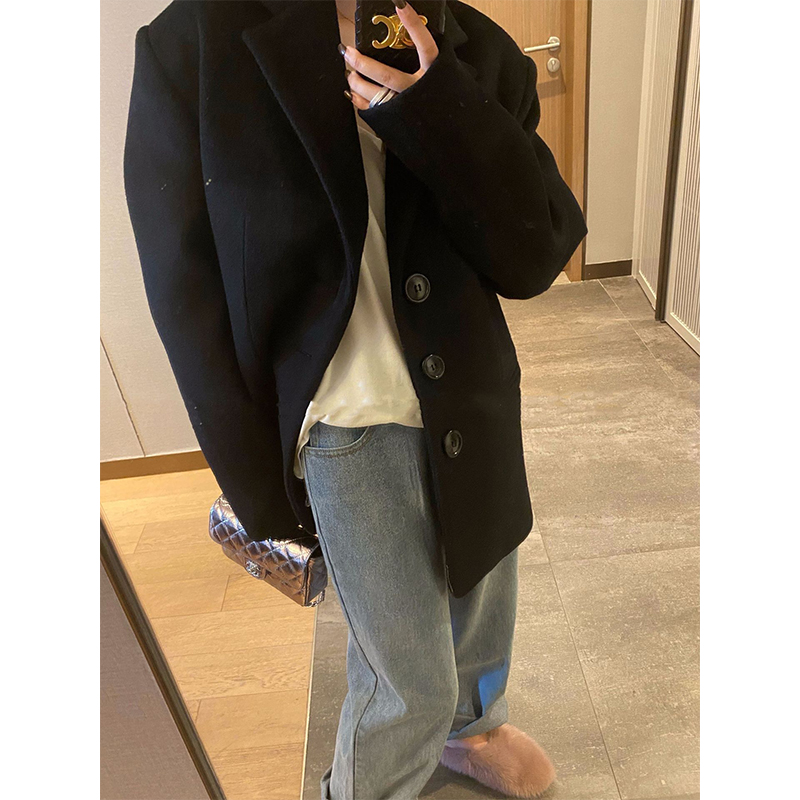 EEwen返场 80羊毛黑色西装外套女冬季加厚宽松小个子西服毛呢大衣