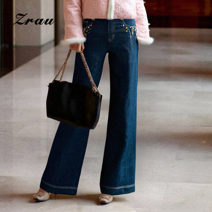 ZRAU【商场同款】秋冬复古时尚休闲高腰直筒裤钉珠设计通勤牛仔裤