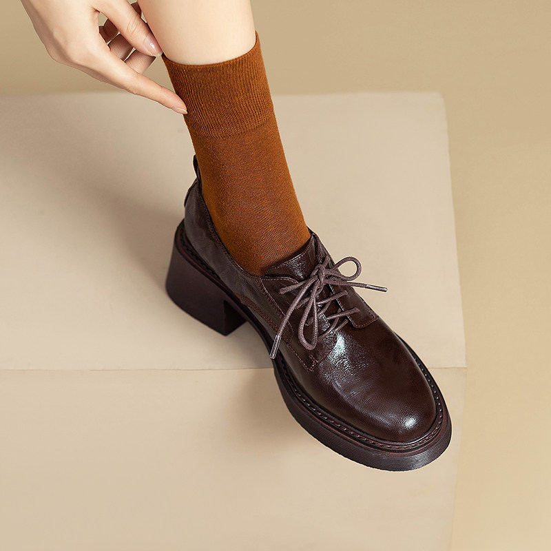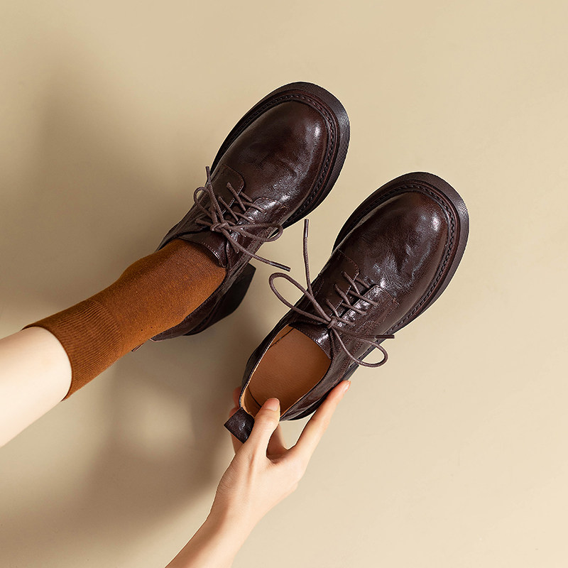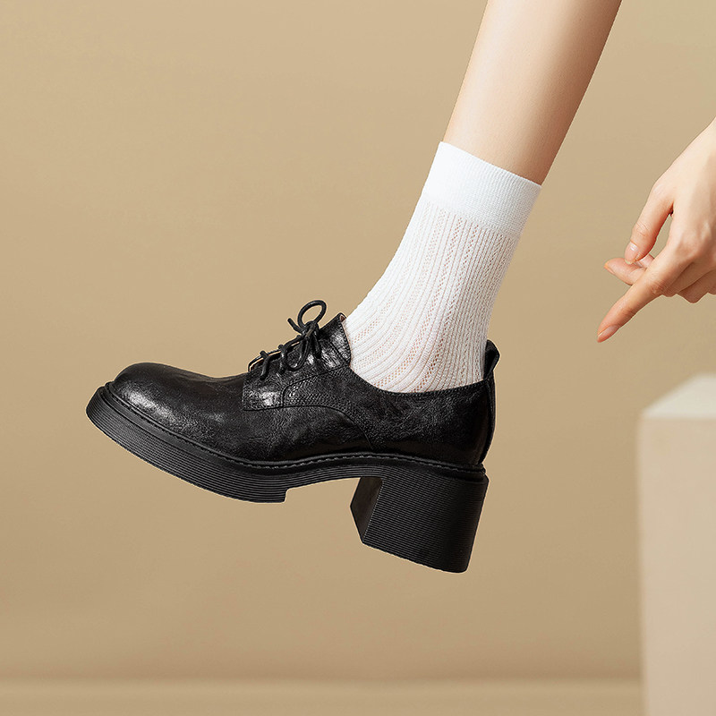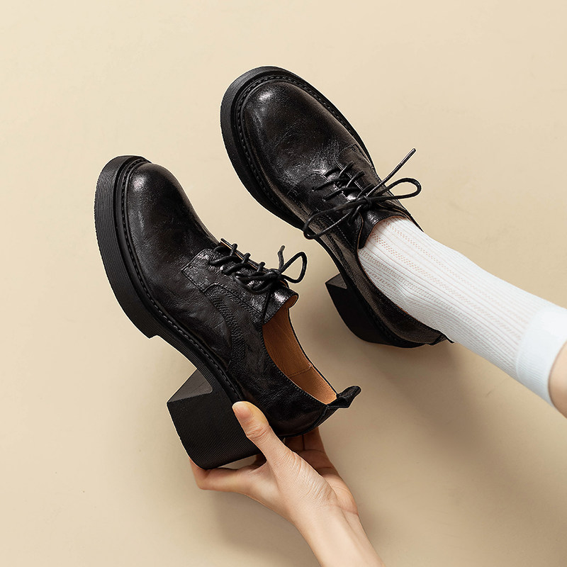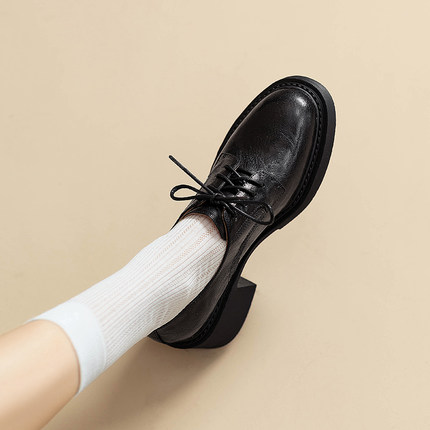巨舒适圆头复古粗跟系带单鞋女高跟春秋季新款休闲英伦风小皮鞋