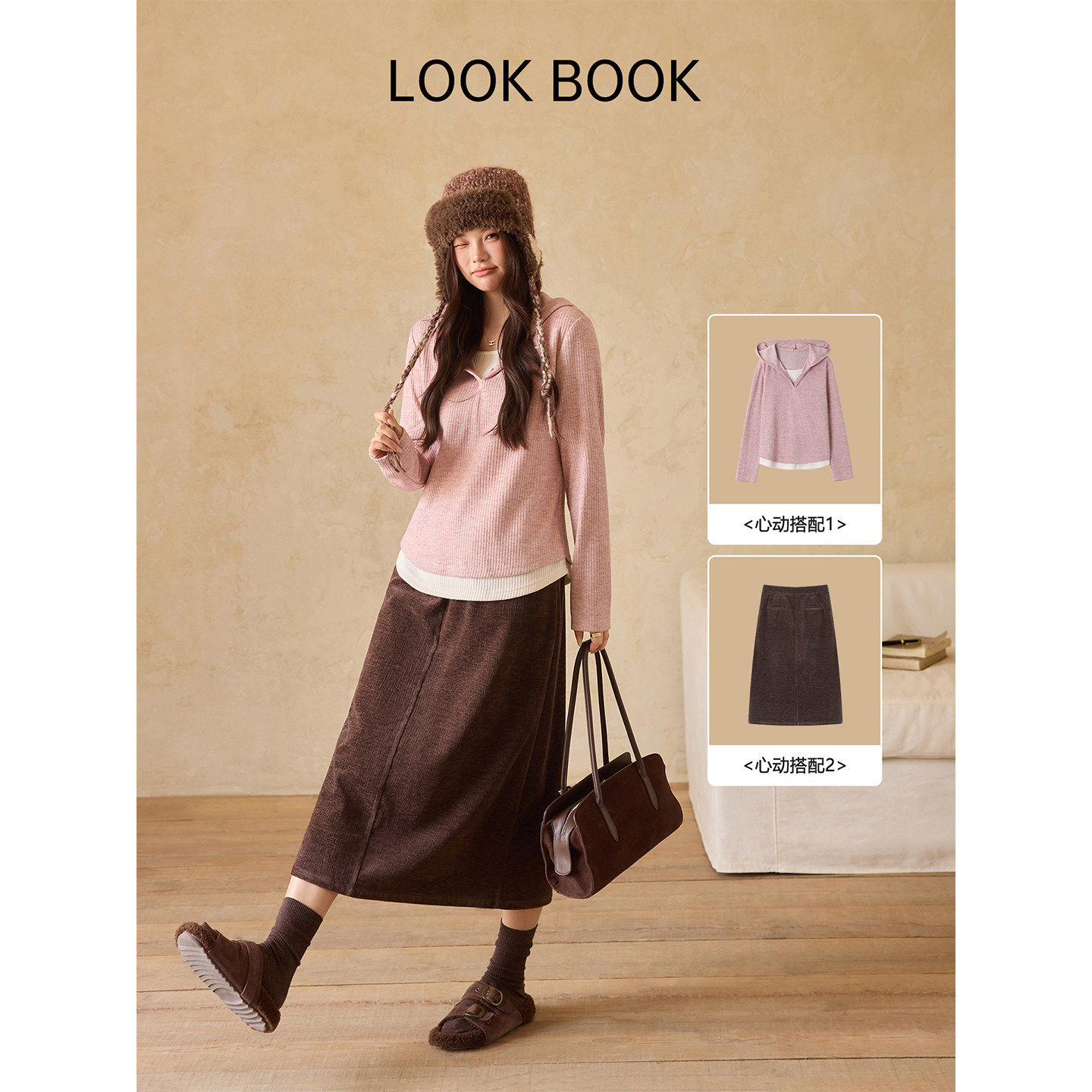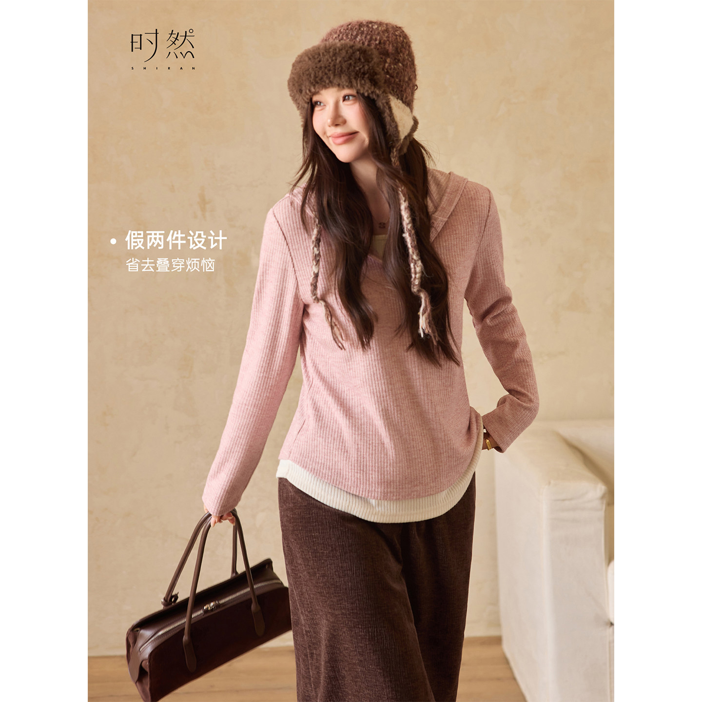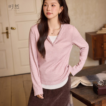 时然大码微胖MM内搭宽松打底针织衫春秋装女孩假两件连帽卫衣原创