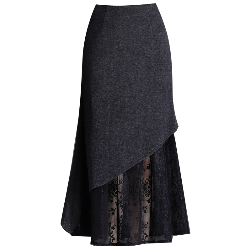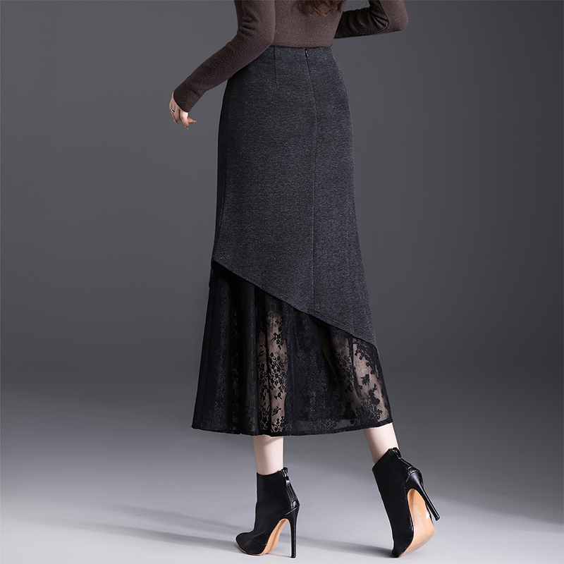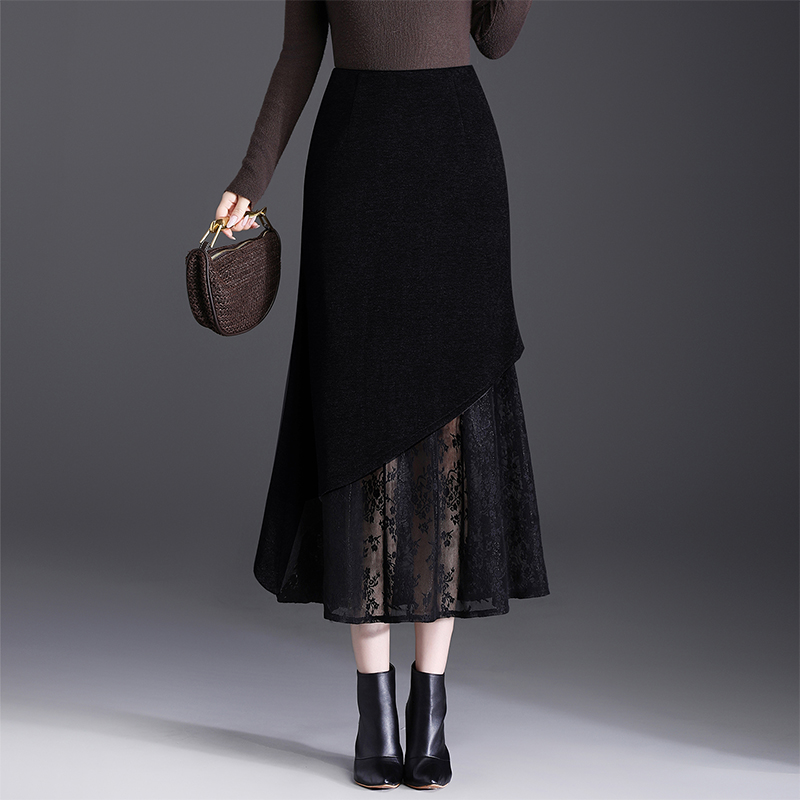 韩式新款毛呢拼接蕾丝半身裙女2025秋冬高腰显瘦包臀裙长裙鱼尾裙