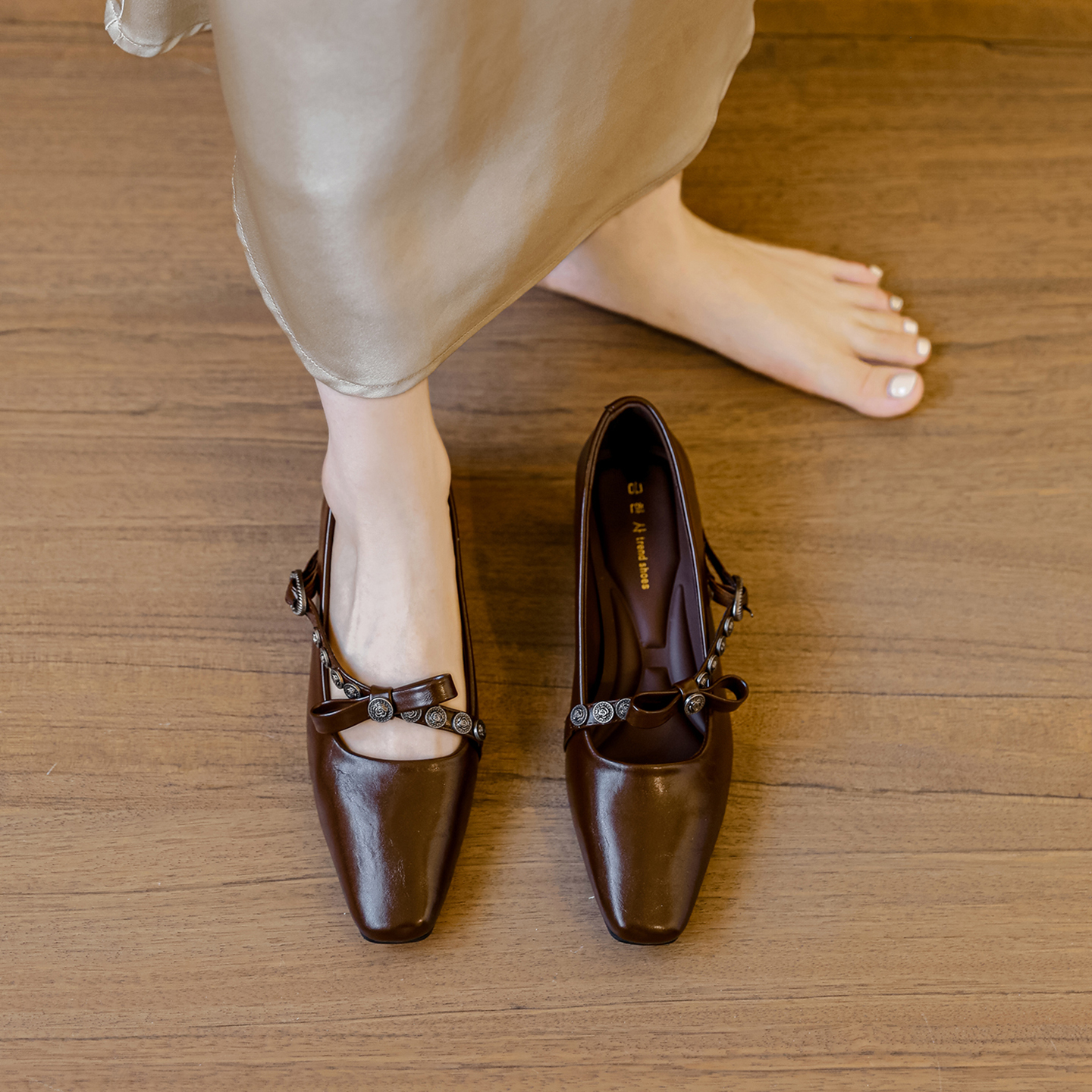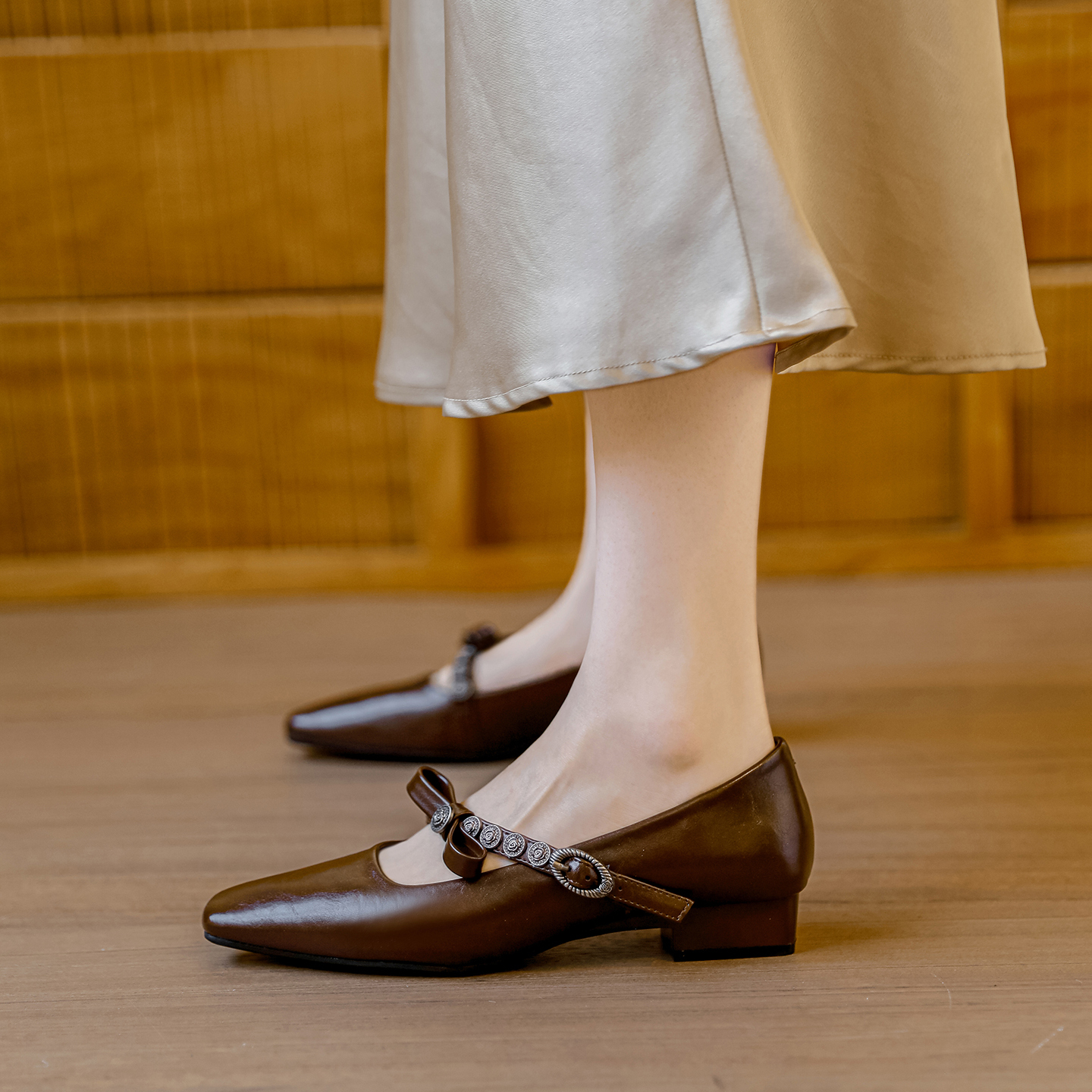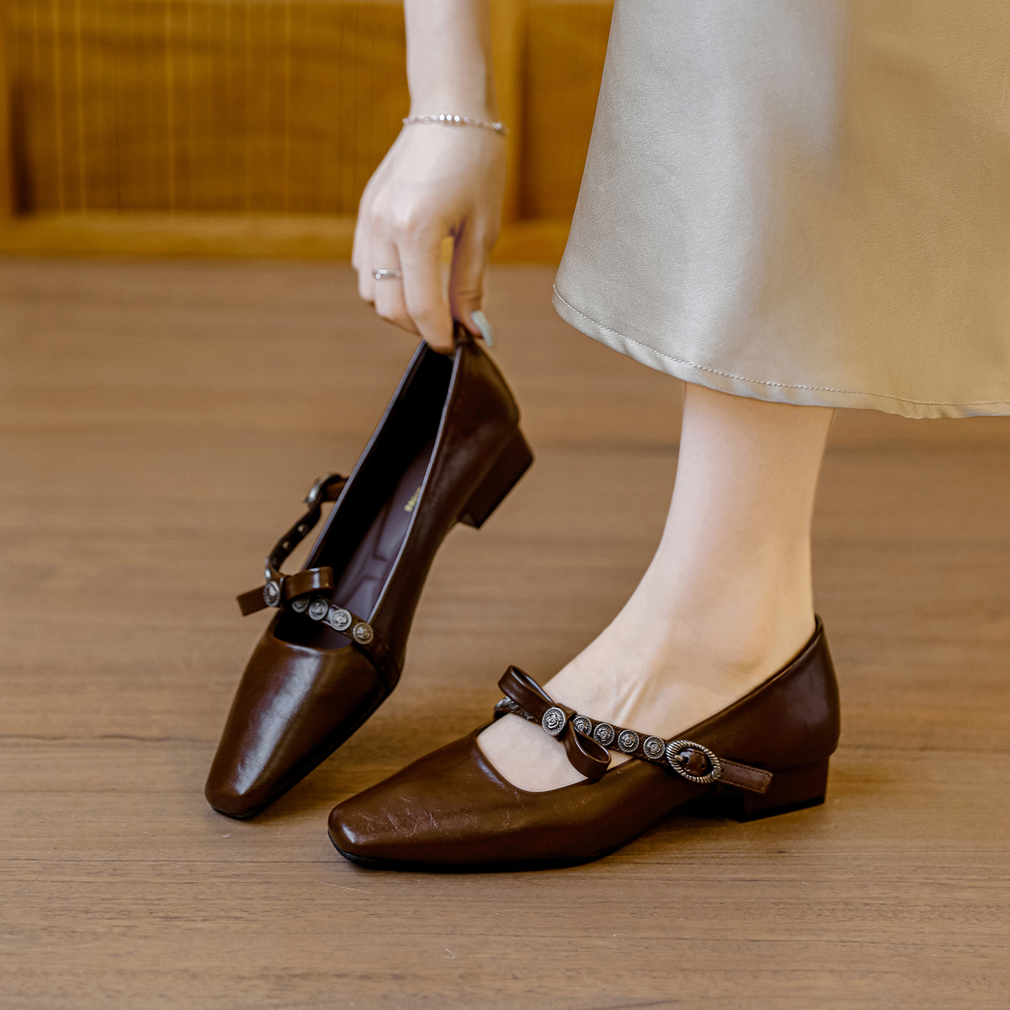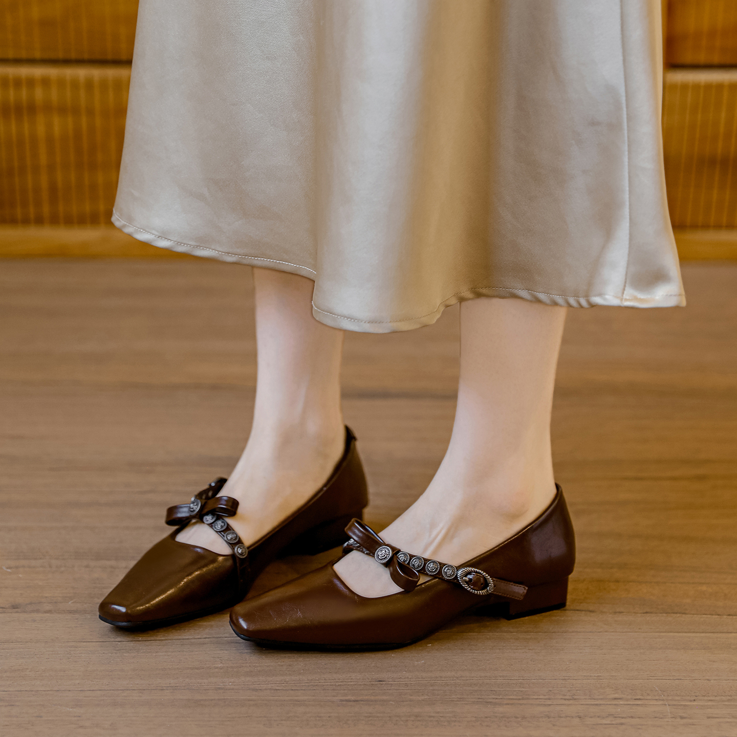 羊皮法式棕色软皮蝴蝶结一字带3cm粗跟方头高跟鞋女春秋浅口单鞋