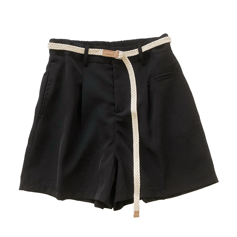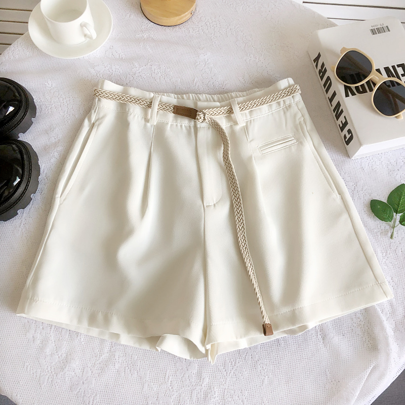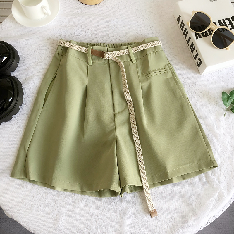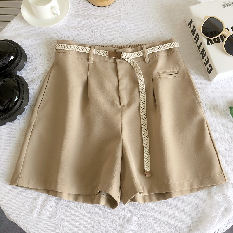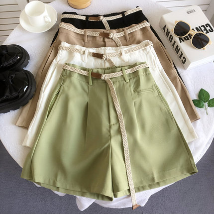 配腰带纯色半松紧高腰A字休闲裤女2023春夏新款百搭外穿阔腿短裤