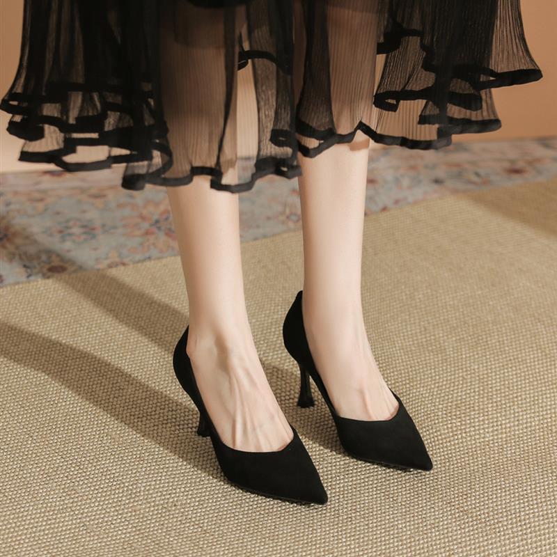 黑色高跟鞋女气质高级不累脚尖头绒面简约职业工作鞋细跟法式单鞋