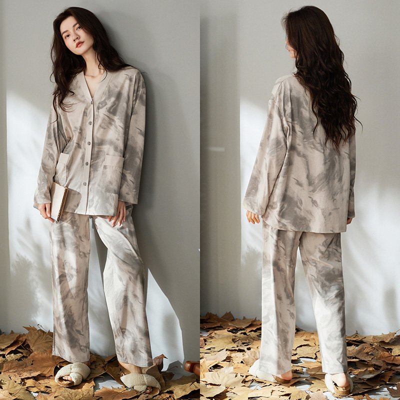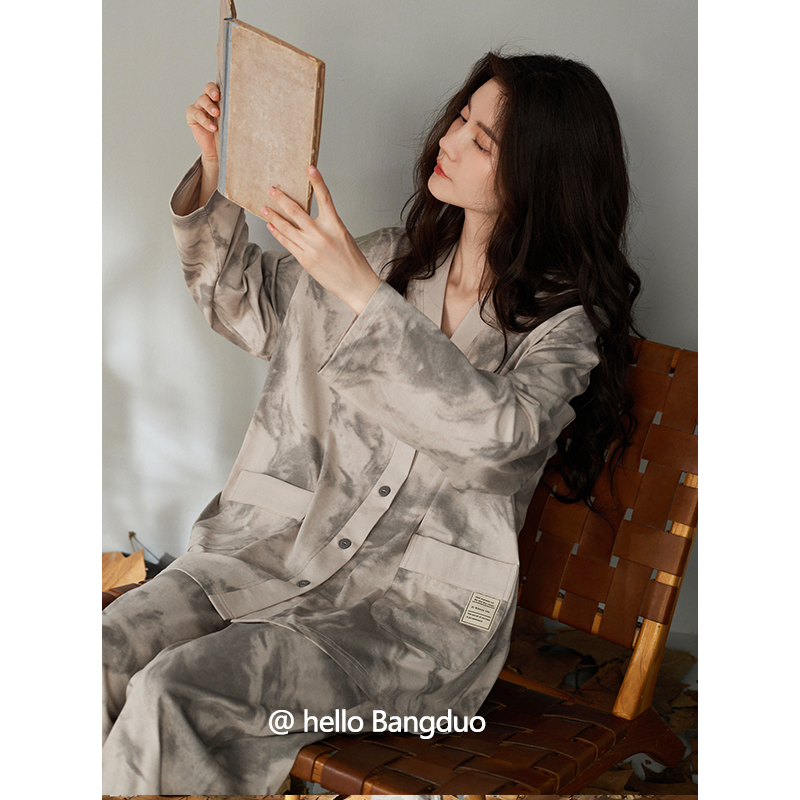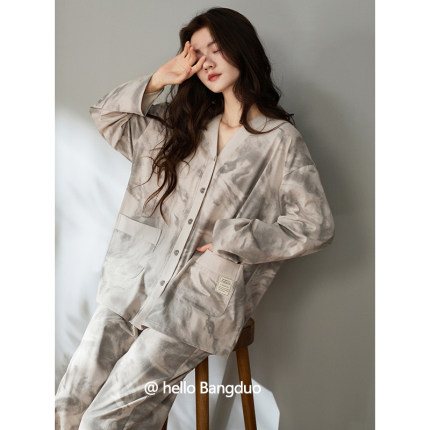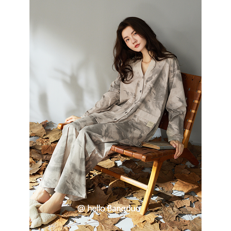 睡衣女士春秋款纯棉长袖女款秋季薄款大码可外穿秋冬水墨画家居服
