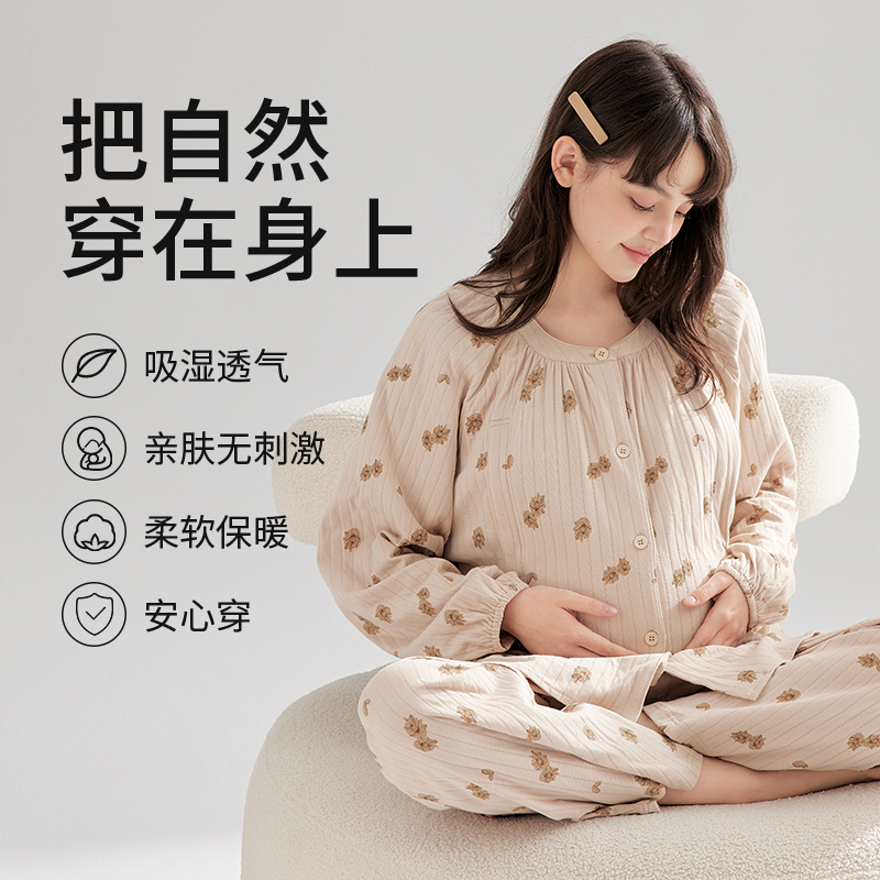 月子服纯棉全棉吸汗产后12月份喂奶可外穿大码秋冬孕妇哺乳睡衣女
