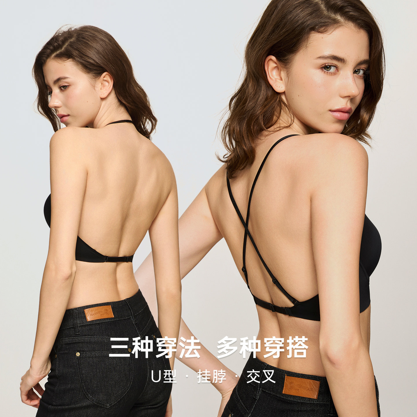柠檬薄荷小胸聚拢隐形无痕大露背文胸 挂脖式性感大u型美背内衣女