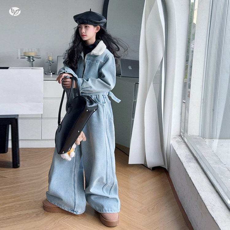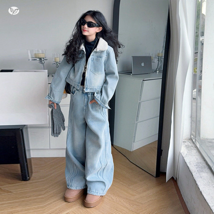 女童加绒牛仔套装2025年秋冬新款中大童浅色短款外套阔腿裤两件套
