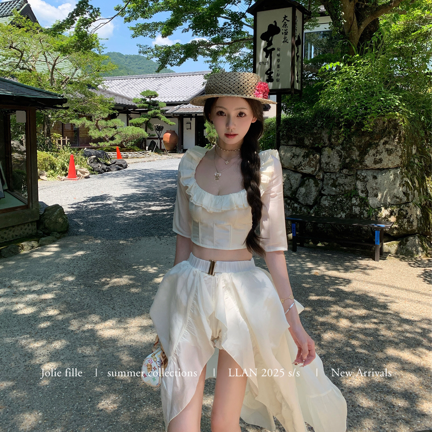 你的懒懒llan【巴黎茶会】荷叶边上衣+灯笼花苞裤+裙摆套装三件套