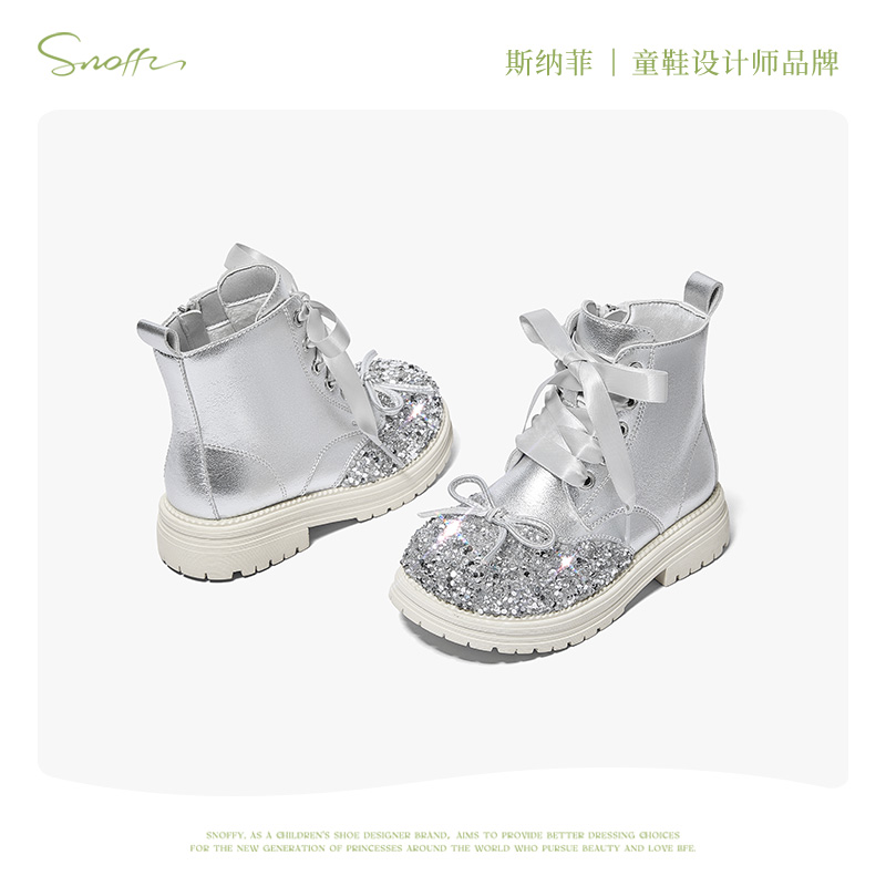 斯纳菲儿童马丁靴女童水晶靴2025秋冬季加绒新款时尚公主短皮靴子