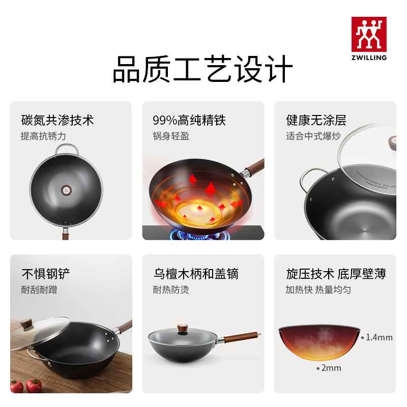 德国双立人龙铁炒套装精铁炒锅铁锅锅具套装铁炒锅不锈钢锅煎锅
