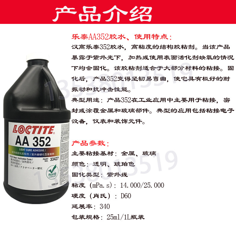 乐泰AA352胶水Loctite352UV胶紫外线固化胶光固化胶粘金属玻璃1L