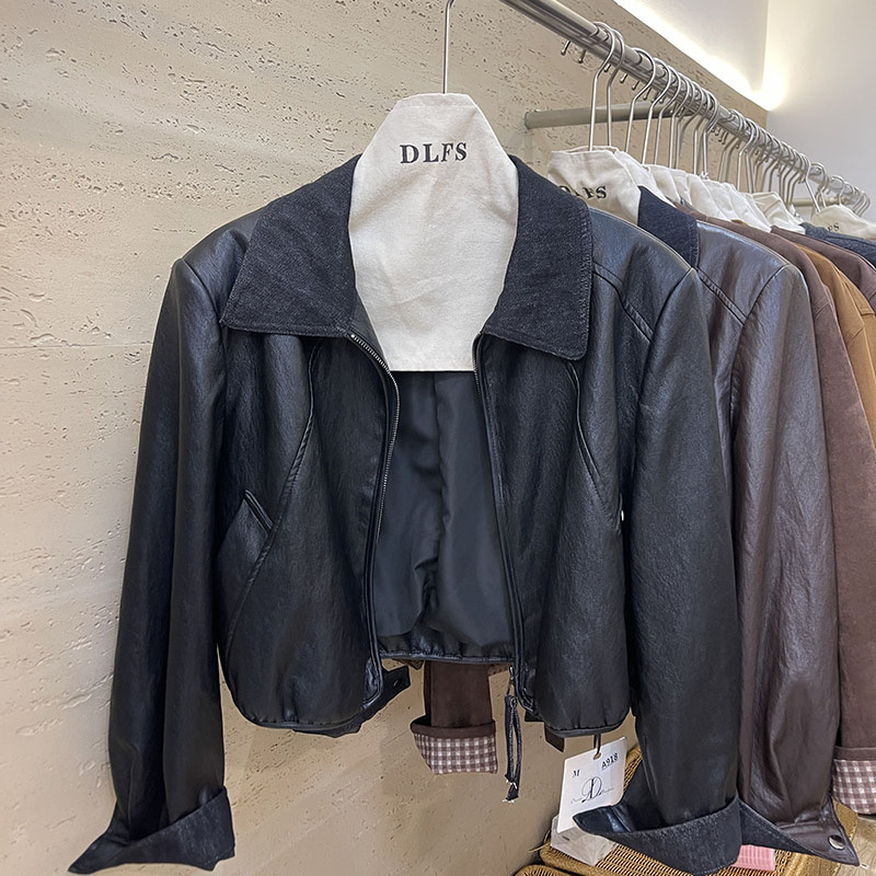 2025新女装时尚休闲百搭短外套女宽松显瘦PU皮衣上衣牛仔拼接设计
