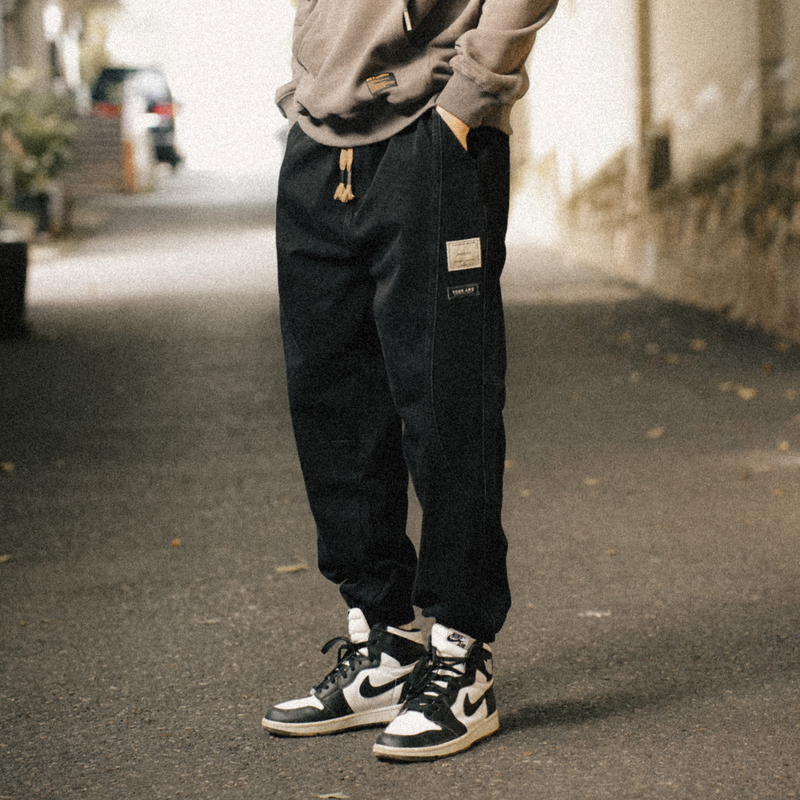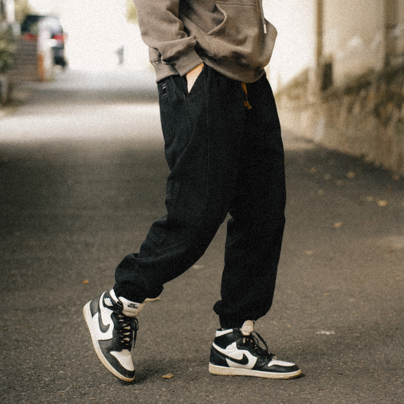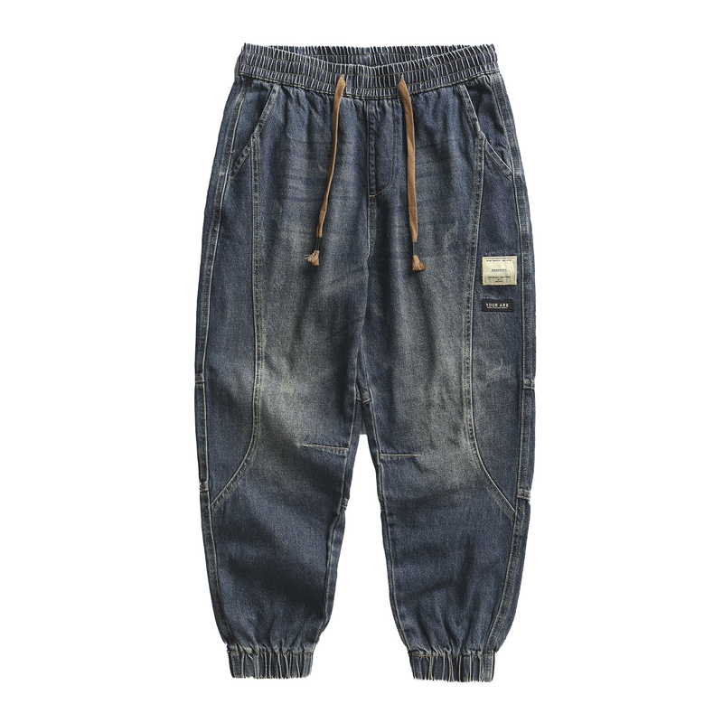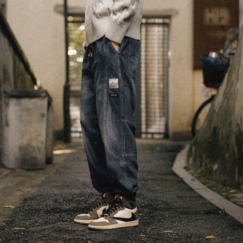 兔先森冬季复古重磅加绒加厚牛仔裤男工装束脚裤做旧水洗休闲裤子