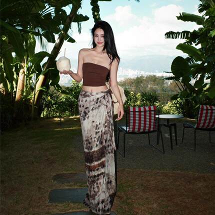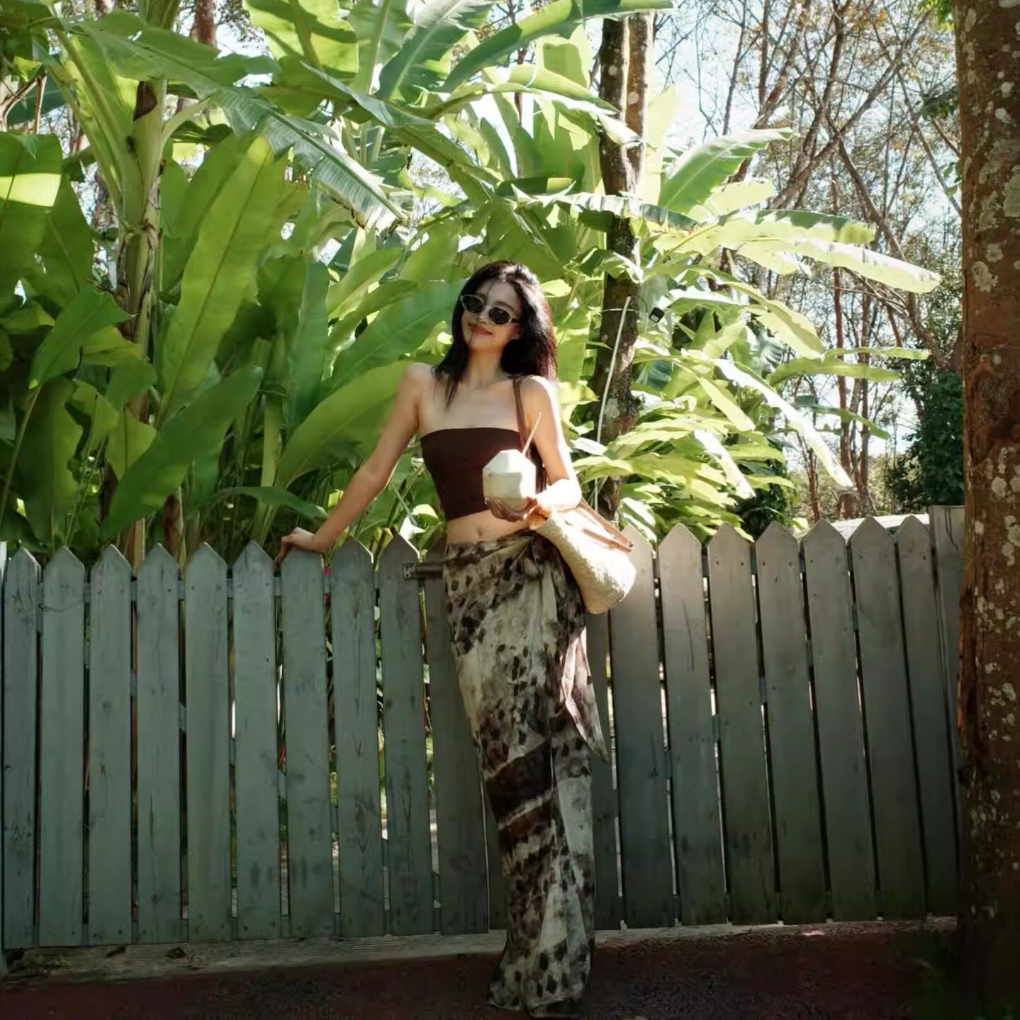 泰国东南亚旅游度假穿搭套装女夏季短款抹胸背心水墨印花半身长裙