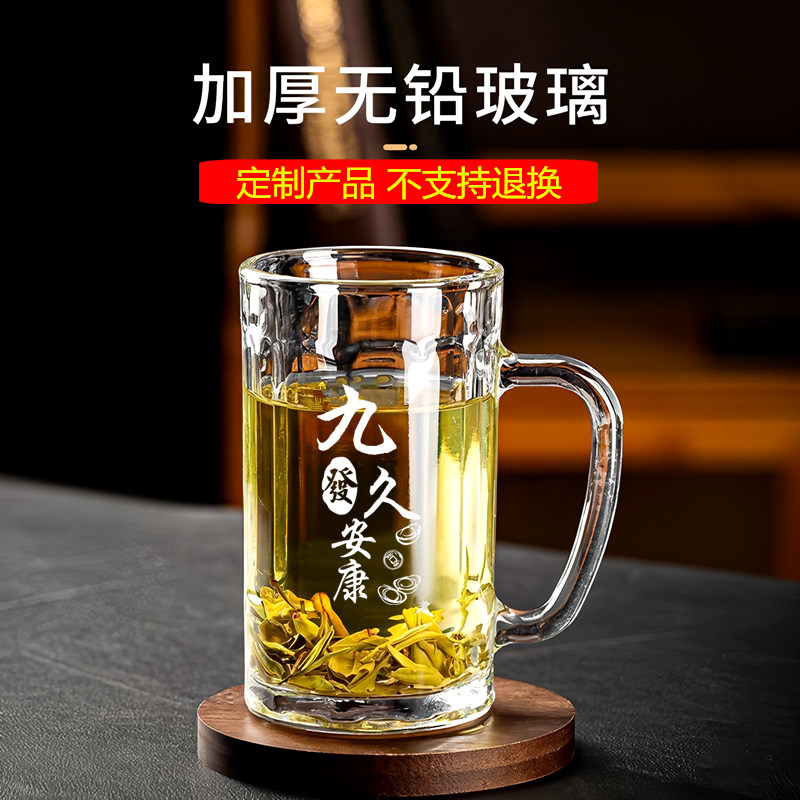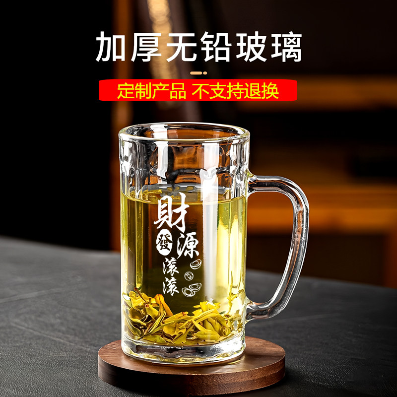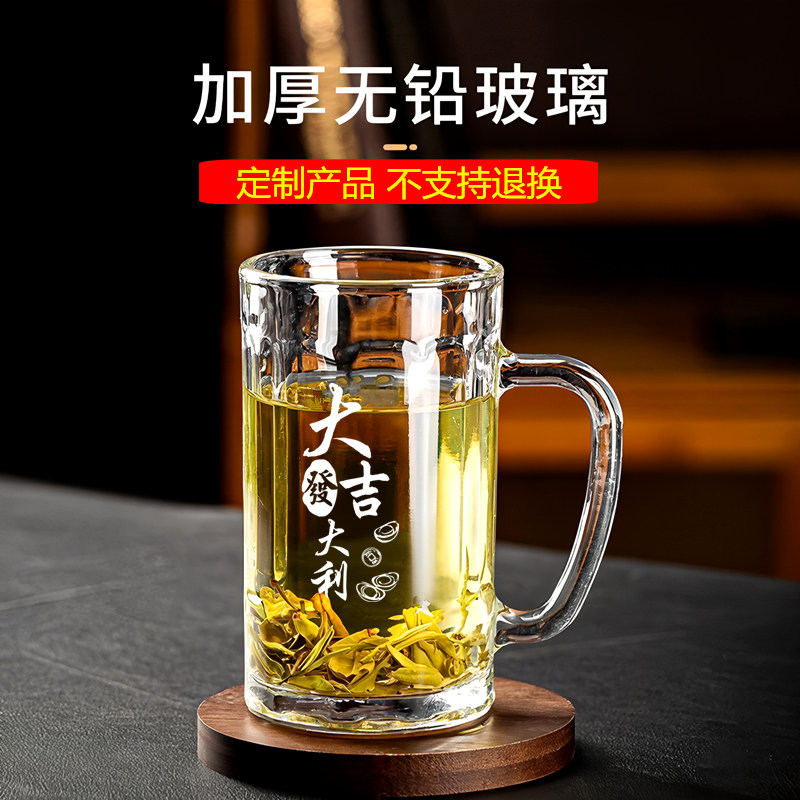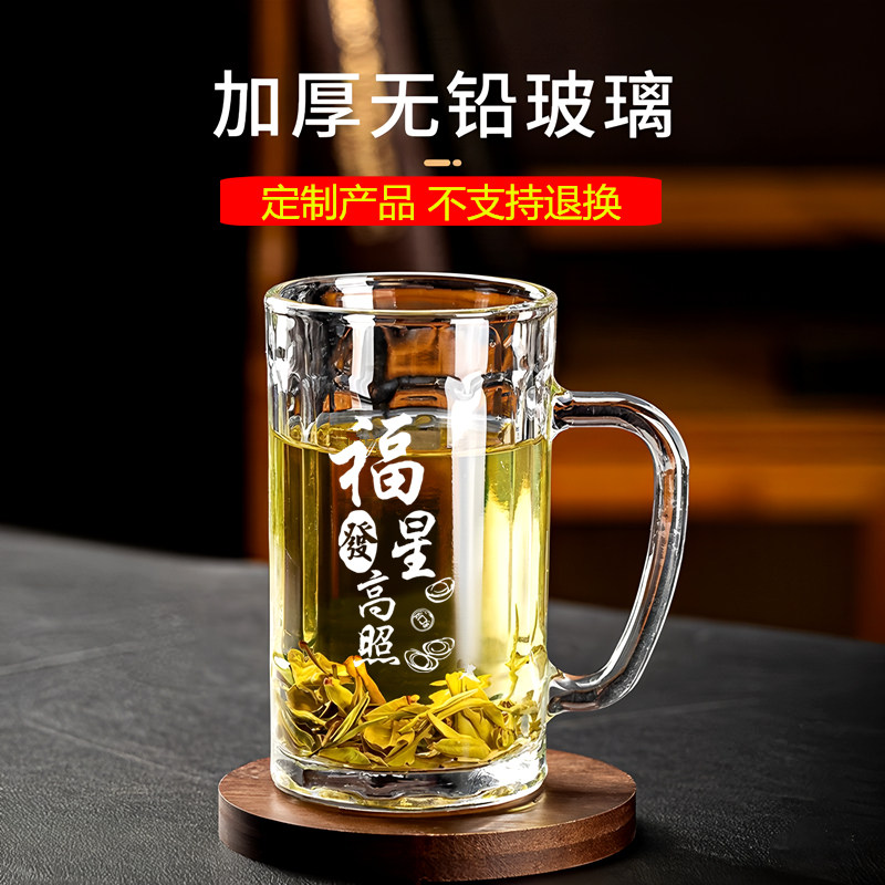 加厚带把手玻璃杯吉祥语茶杯耐热水杯商用棋牌泡茶杯定制刻字杯子