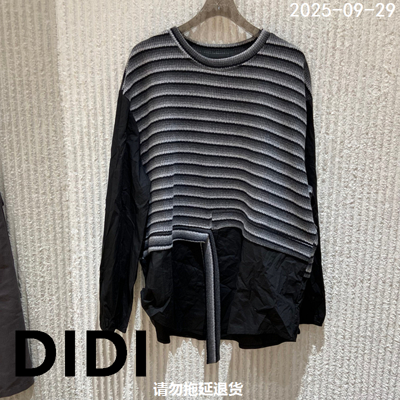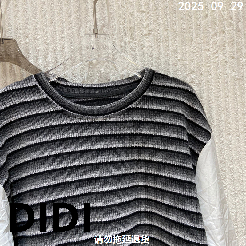 欧洲站2025秋季新款圆领条纹针织拼接撞色假两件长袖衬衫女6112