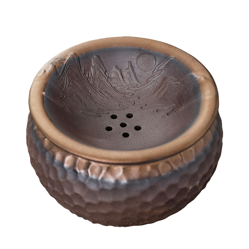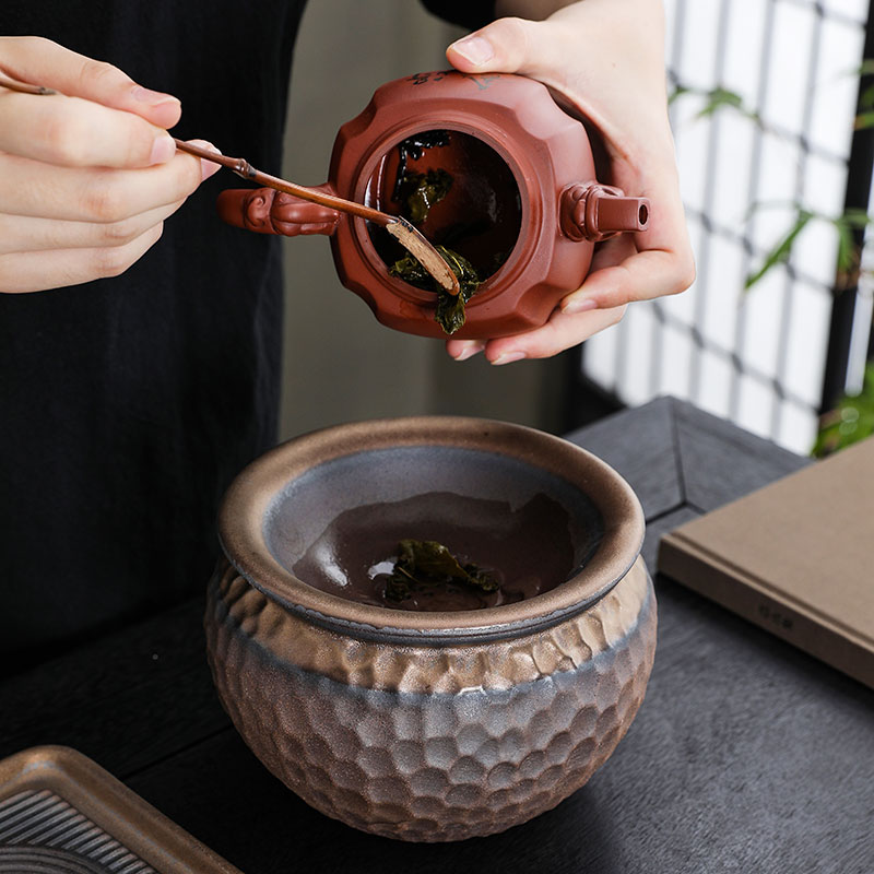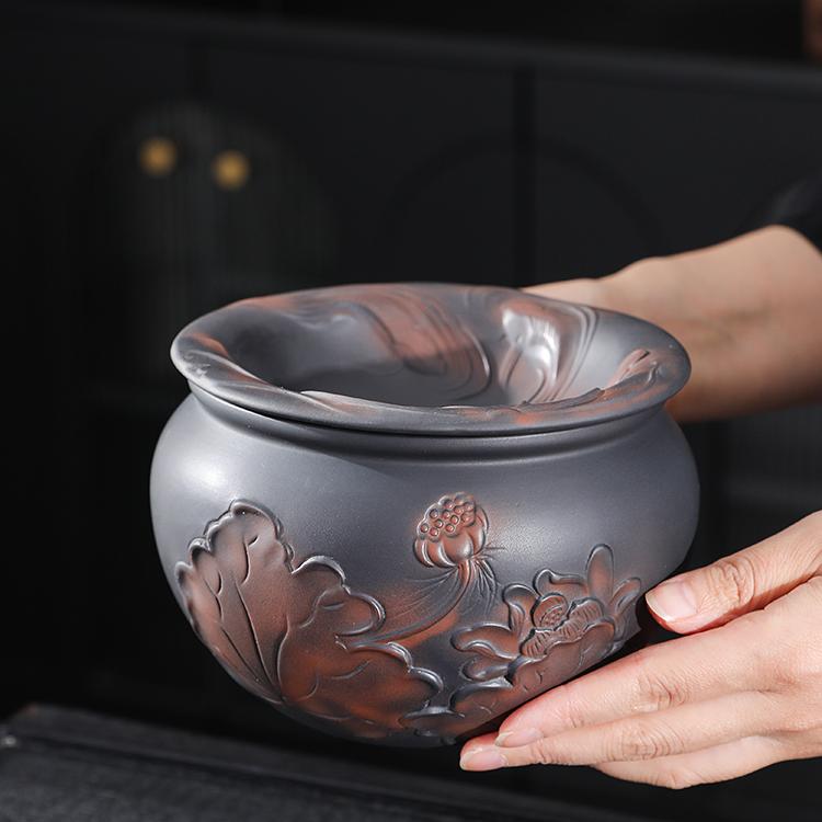 千里江山茶渣缸桌面废水缸垃圾桶带过滤干湿分离粗陶水盂茶洗家用