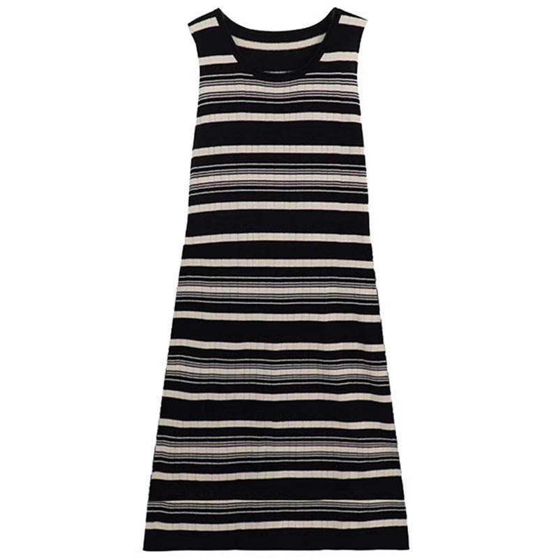 法式撞色条纹无袖连衣裙女夏季中长款过膝小个子修身收腰针织长裙