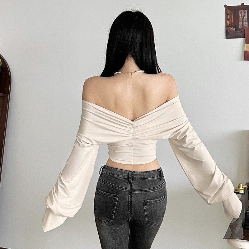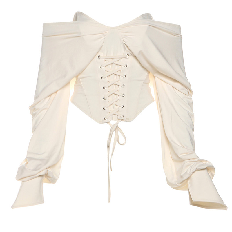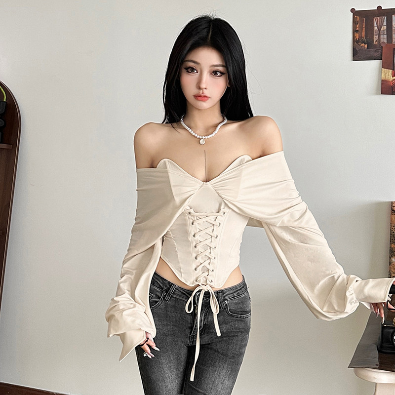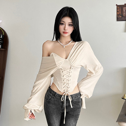 纯欲辣妹绑带鱼骨一字肩长袖T恤