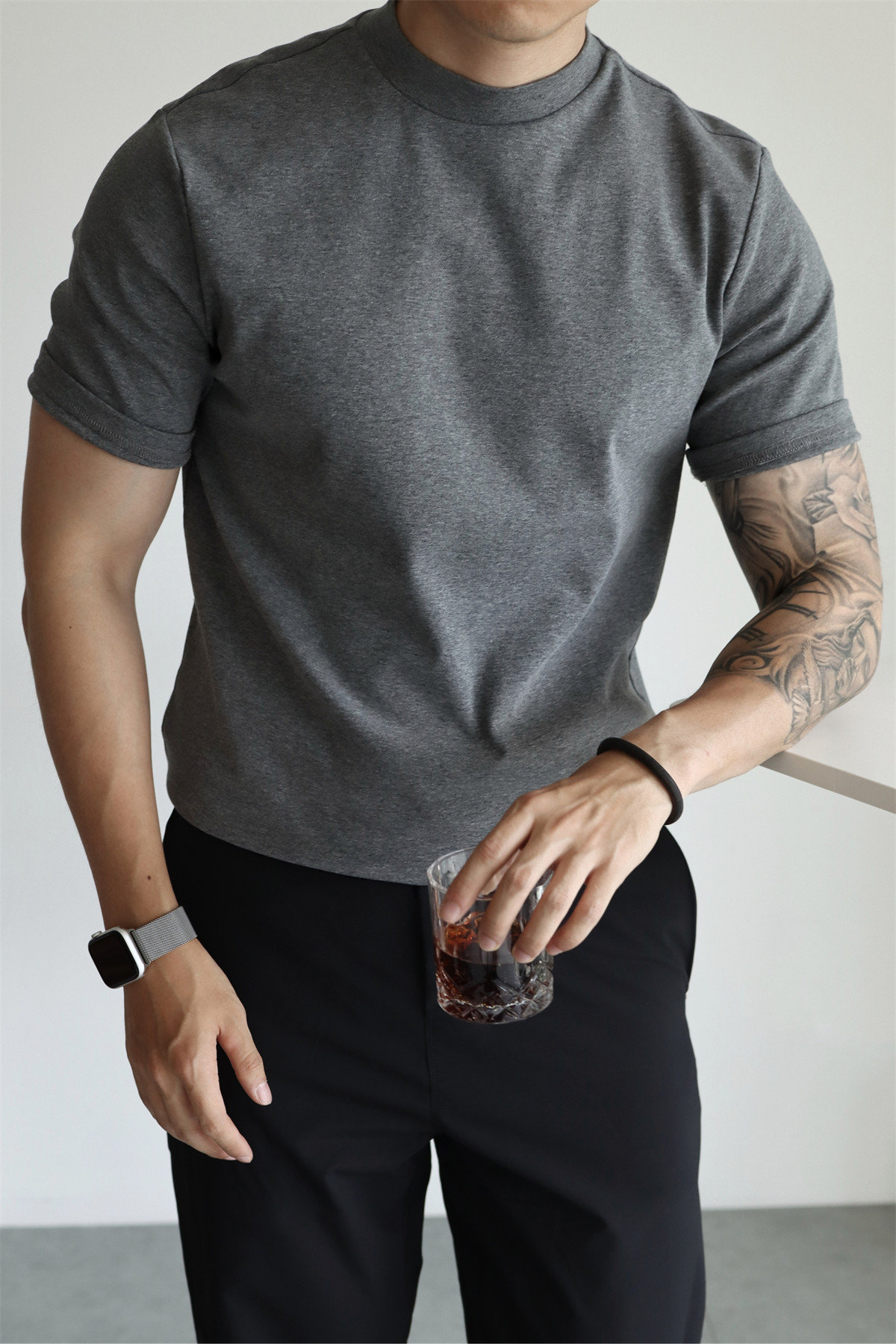 YUXIAN美式纯棉260克重磅短袖中领弹力复古男士半高领T恤纯色春夏